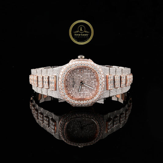 Rose Gold and Silver Iced-Out Diamond Watch with Roman Numeral Dial Radiating timeless elegance and...