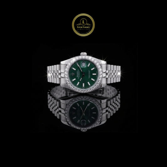 Luxury Silver Diamond Bezel Watch with Emerald Green Dial This elegant timepiece showcases a striking...