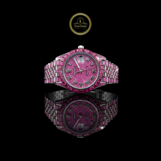 Vibrant Pink Sapphire-Set Luxury Watch with Roman Numeral Dial This stunning luxury watch features a...