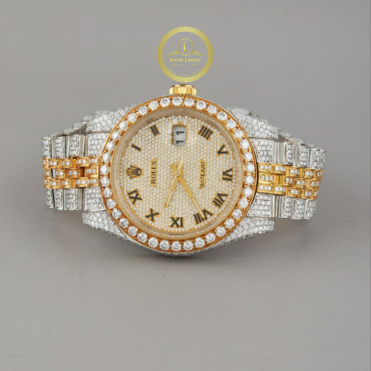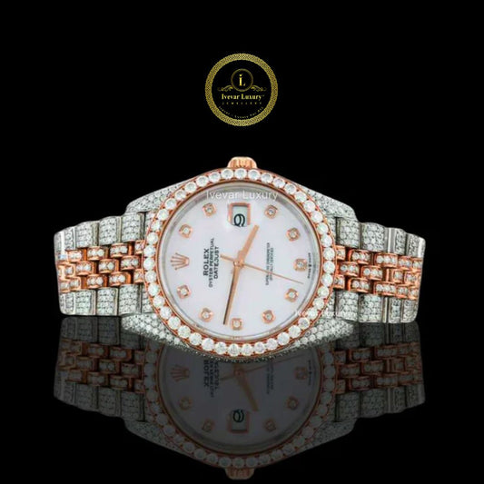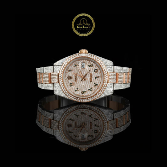 Rose Gold and Silver Iced-Out Diamond Watch with Arabic Numeral Dial Experience the perfect harmony...