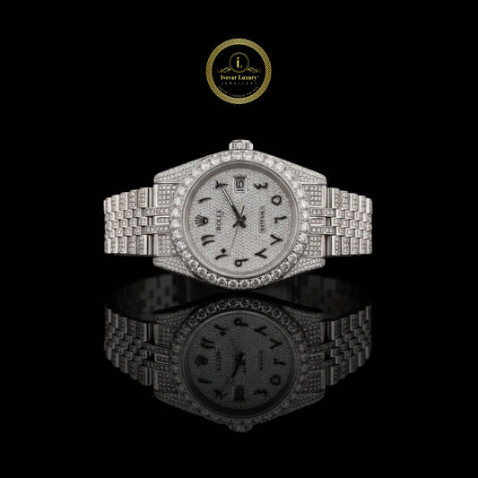 All-Silver Diamond Pave Luxury Watch with Arabic Numeral Dial This stunning all-silver diamond watch radiates...