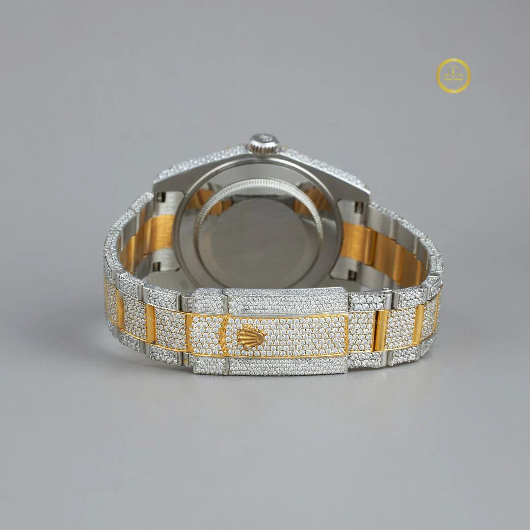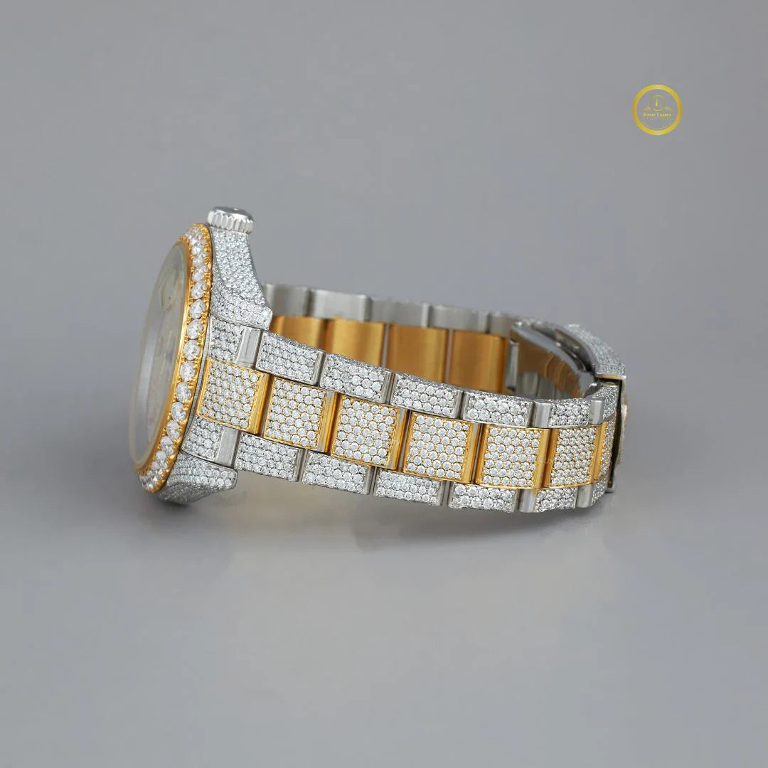 This luxurious timepiece radiates opulence with its fully diamond-paved case, bezel, and bracelet, highlighted by elegant gold accents that enhance its brilliance. The shimmering dial features a playful array of multicolored Arabic numerals, adding a vibrant and distinctive touch to its refined design. A date display at the 3 o’clock position provides practical functionality, while the two-tone diamond-set bracelet combines sophistication with superior craftsmanship. Perfect for those who appreciate bold elegance and unparalleled luxury, this watch is a dazzling statement piece that commands attention by Ivevar.