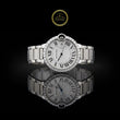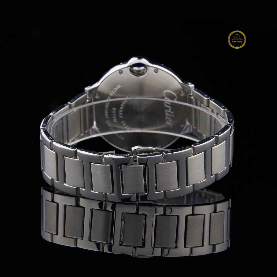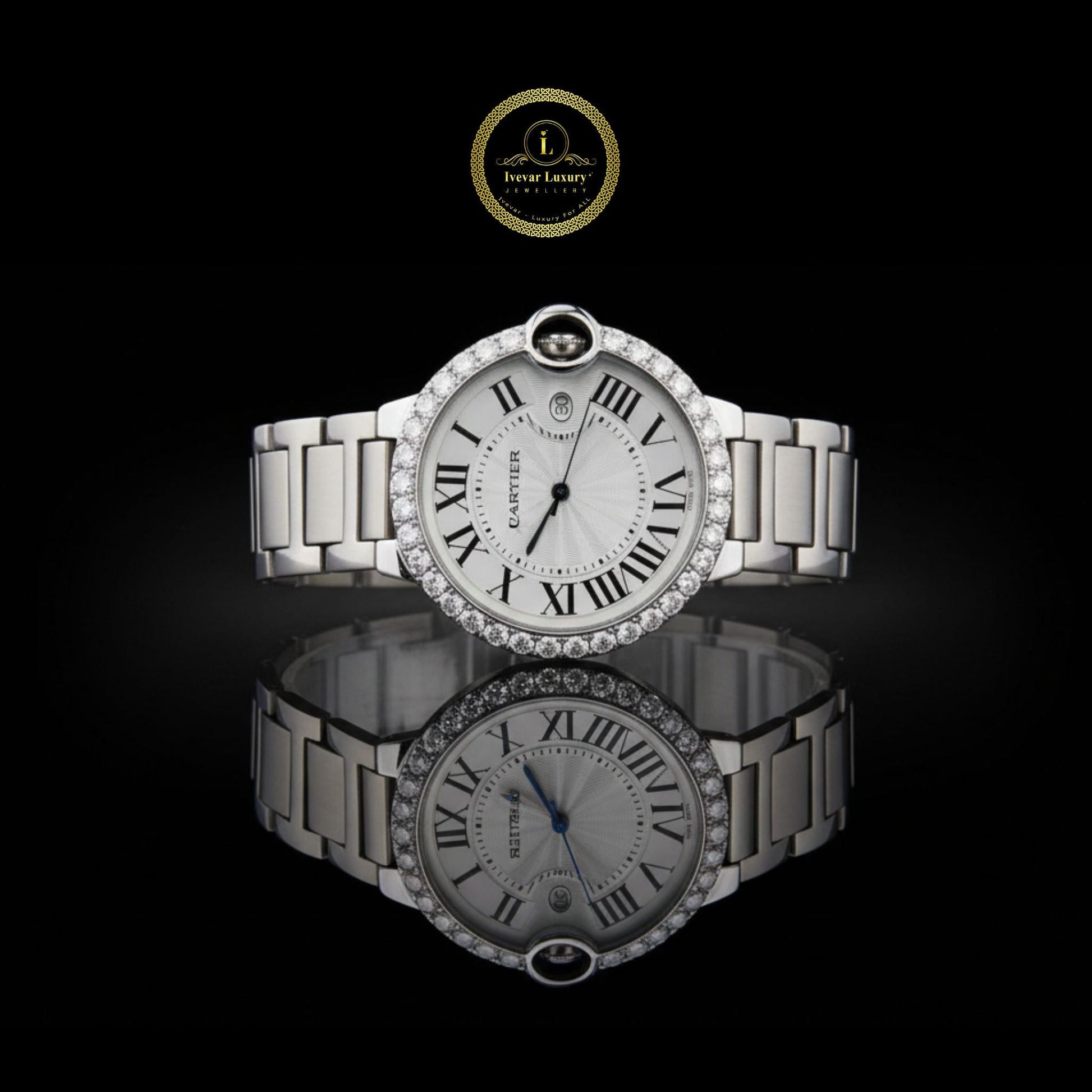 This exquisite luxury watch is a symbol of timeless sophistication and refined craftsmanship. Featuring a round case beautifully adorned with a brilliant diamond-set bezel, it captures light from every angle, exuding pure elegance. The silver-toned dial showcases bold Roman numerals and sleek blue sword-shaped hands, offering a perfect blend of classic charm and modern precision. Crafted from premium stainless steel, the polished bracelet ensures both durability and comfort. A true expression of grace, precision, and luxury, this timepiece is designed for those who appreciate understated elegance and superior artistry.