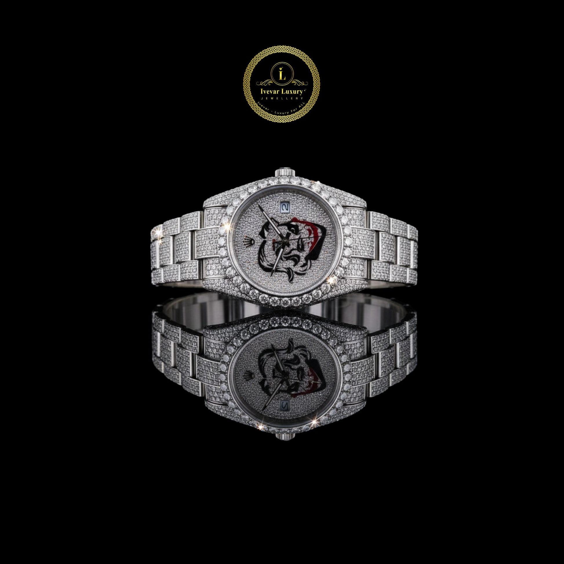 This luxurious wristwatch features a fully diamond-encrusted design, showcasing an intricate pattern of brilliant round cut stones across the bracelet, bezel, and dial. The face of the watch is adorned with a striking artistic motif in black and red, adding a bold and unique touch to its opulent aesthetic. A date window at the 12 o’clock position complements the elegant silver-tone hands, while the overall craftsmanship exudes exclusivity and sophistication—perfect for those who appreciate high-end statement timepieces.
