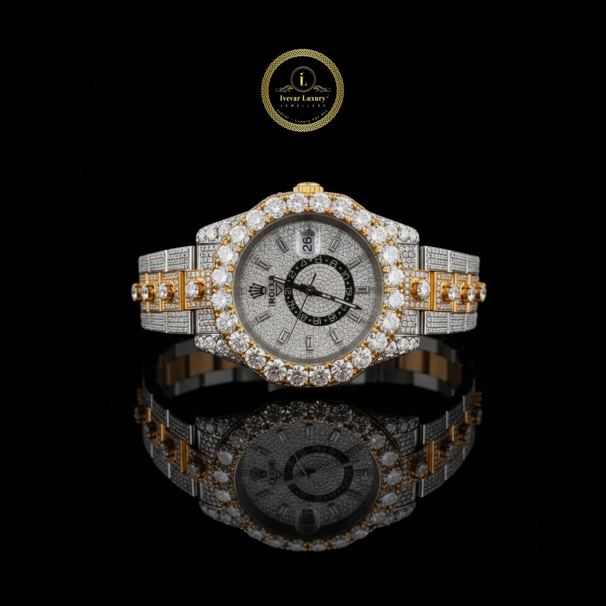 Radiating pure grandeur, this Two-Tone Diamond Bezel Luxury Watch is a masterpiece of brilliance and craftsmanship. The watch features an intricately paved silver dial, surrounded by a bold round bezel adorned with large round-cut diamonds. Gold accents along the bracelet add a rich contrast to the fully diamond-encrusted design, creating a striking two-tone aesthetic. Complete with a date display and precision detailing, this timepiece is the ultimate expression of prestige and modern opulence.
