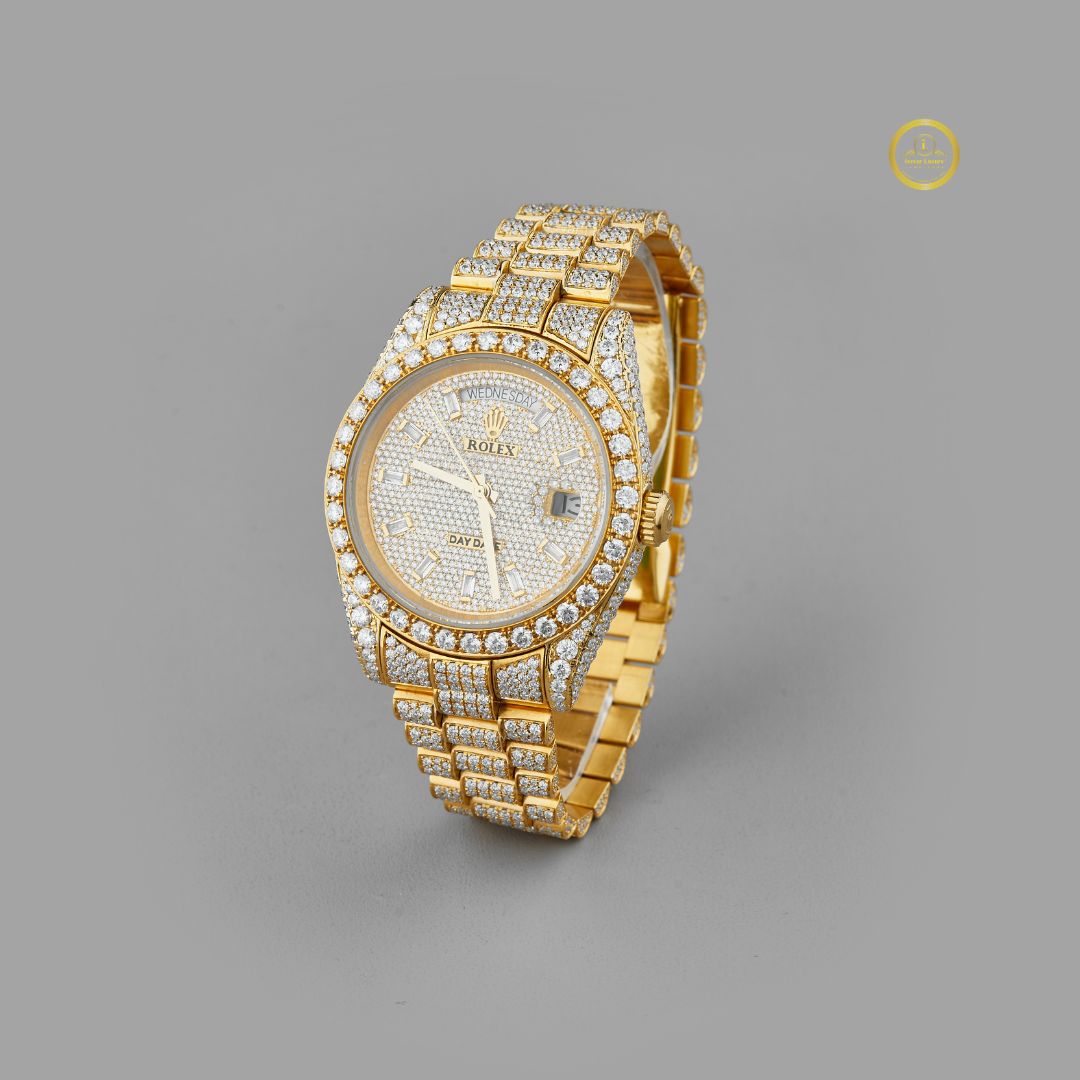 An extraordinary creation of brilliance and prestige, this Exquisite Yellow Gold Fully Iced-Out Diamond Timepiece epitomizes the art of luxury watchmaking. Every surface—from the meticulously pavé-set dial to the dazzling round diamond-encrusted bezel and bracelet—radiates unmatched opulence and craftsmanship. The warm glow of yellow gold enhances the luminous sparkle of each hand-set diamond, creating a captivating harmony of light and elegance. Designed for the connoisseur who commands attention, this timepiece unites precision engineering with high jewelry artistry, standing as a true symbol of power, sophistication, and timeless allure.
