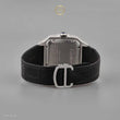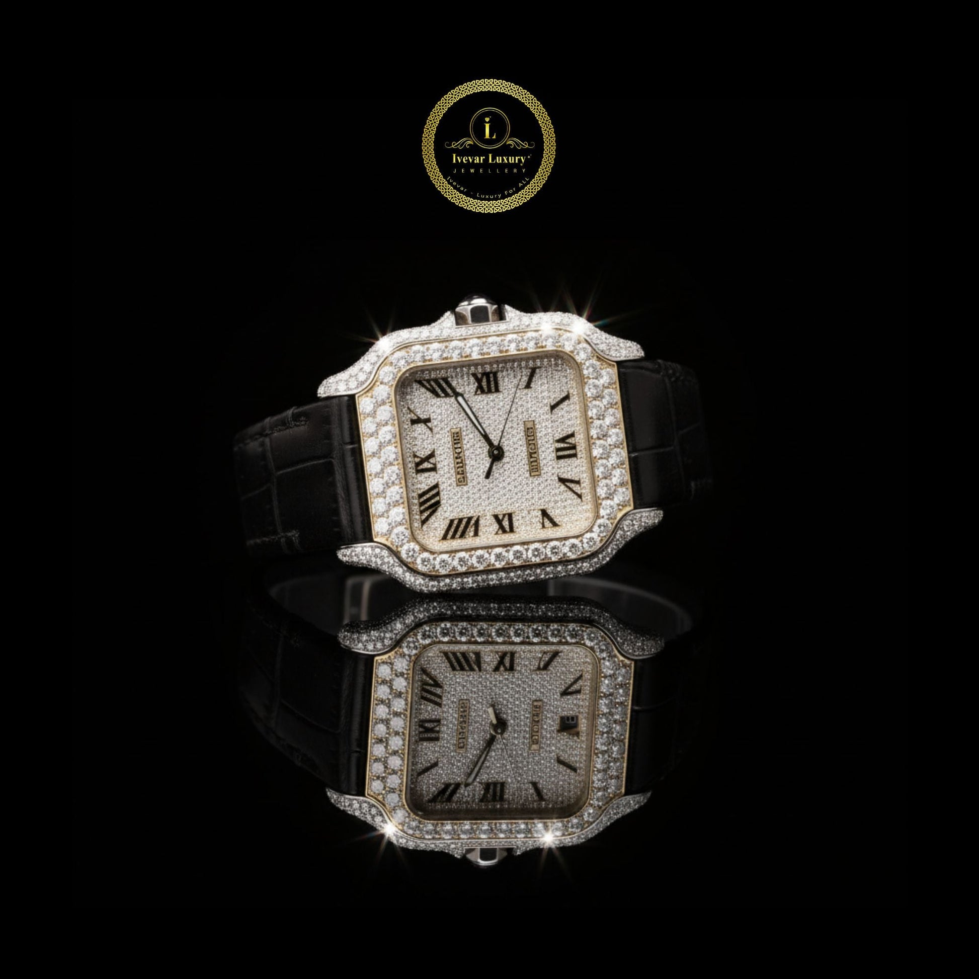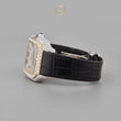 This luxury watch showcases an elegant square design, brilliantly adorned with shimmering diamonds across the bezel and dial. The black Roman numerals add a touch of classic sophistication, while the sleek black leather strap enhances its refined appeal. Perfect for those who appreciate timeless elegance and flawless craftsmanship, this timepiece is a true symbol of luxury and prestige.