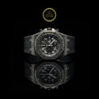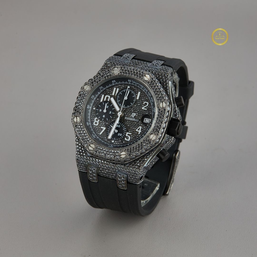 This bold luxury watch combines sporty design with elegant craftsmanship, featuring a black diamond-encrusted bezel that adds a touch of refined sophistication. The chronograph functionality ensures precision timekeeping, while the matte black strap offers both comfort and durability. Designed for those who value performance and style, this timepiece makes a powerful statement of confidence and exclusivity.