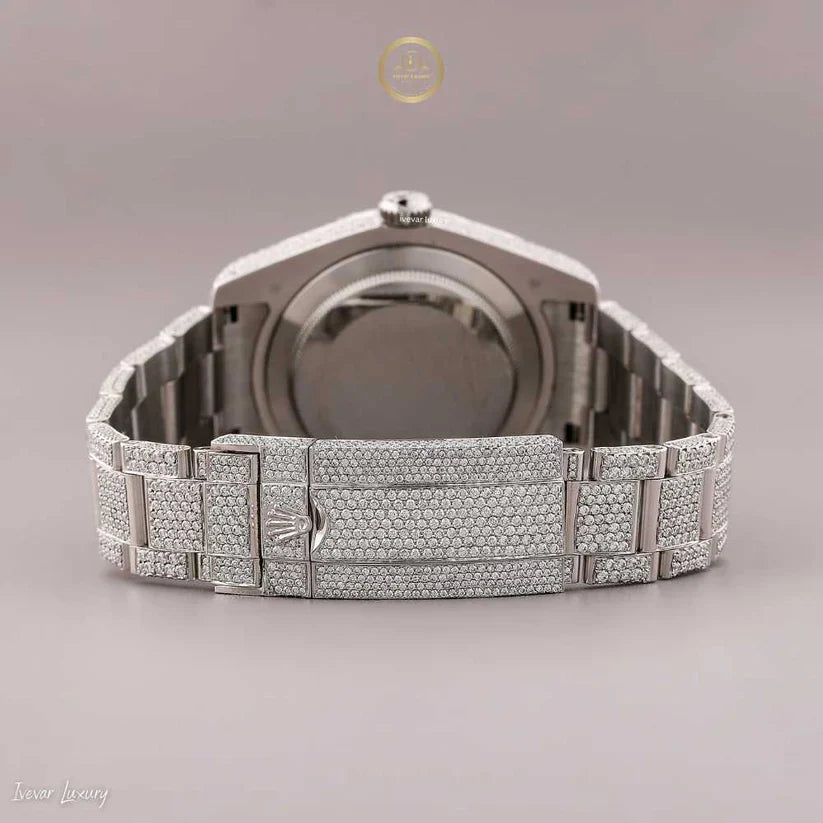 A masterpiece of elegance and craftsmanship, this Emerald Green Color Dial Diamond-Encrusted Luxury Watch radiates sophistication and power. The vibrant green dial is framed by a fully iced-out watch, featuring meticulously set round-cut diamonds that exude brilliance from every angle in silver finish. Its luminous markers and date display add both style and functionality, making it a statement accessory for the modern connoisseur of luxury.