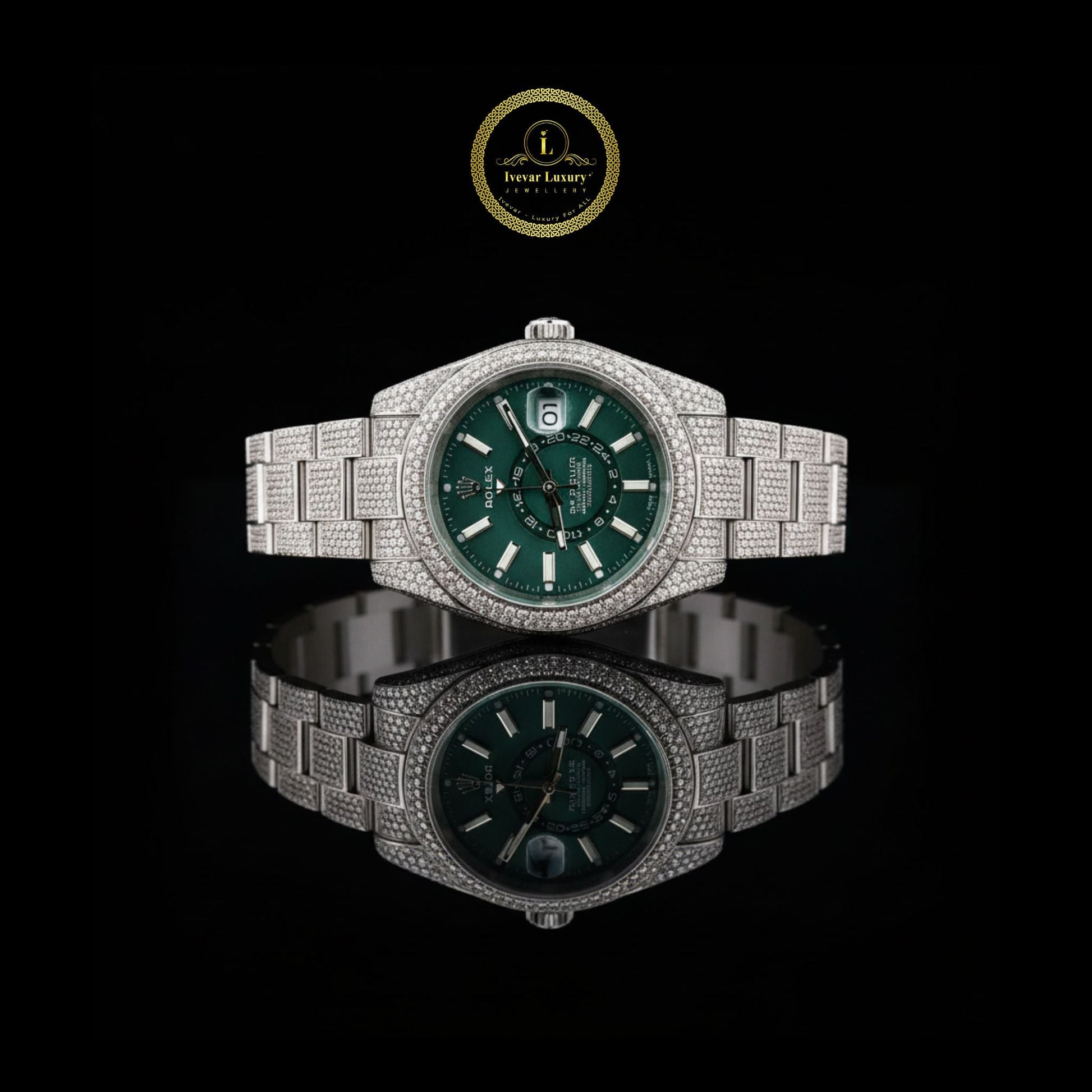 Emerald Green Dial Diamond-Encrusted Luxury Watch in Silver Finish