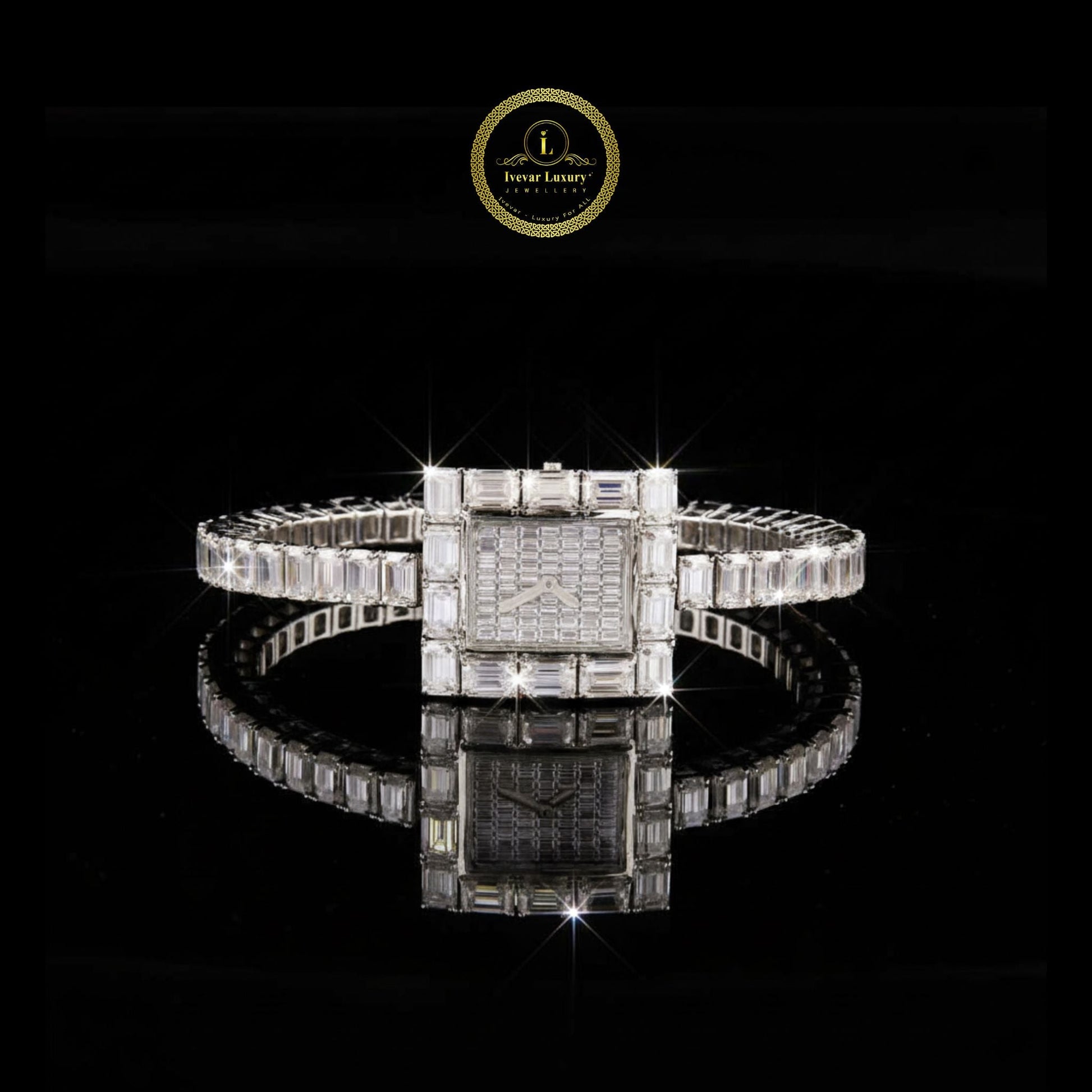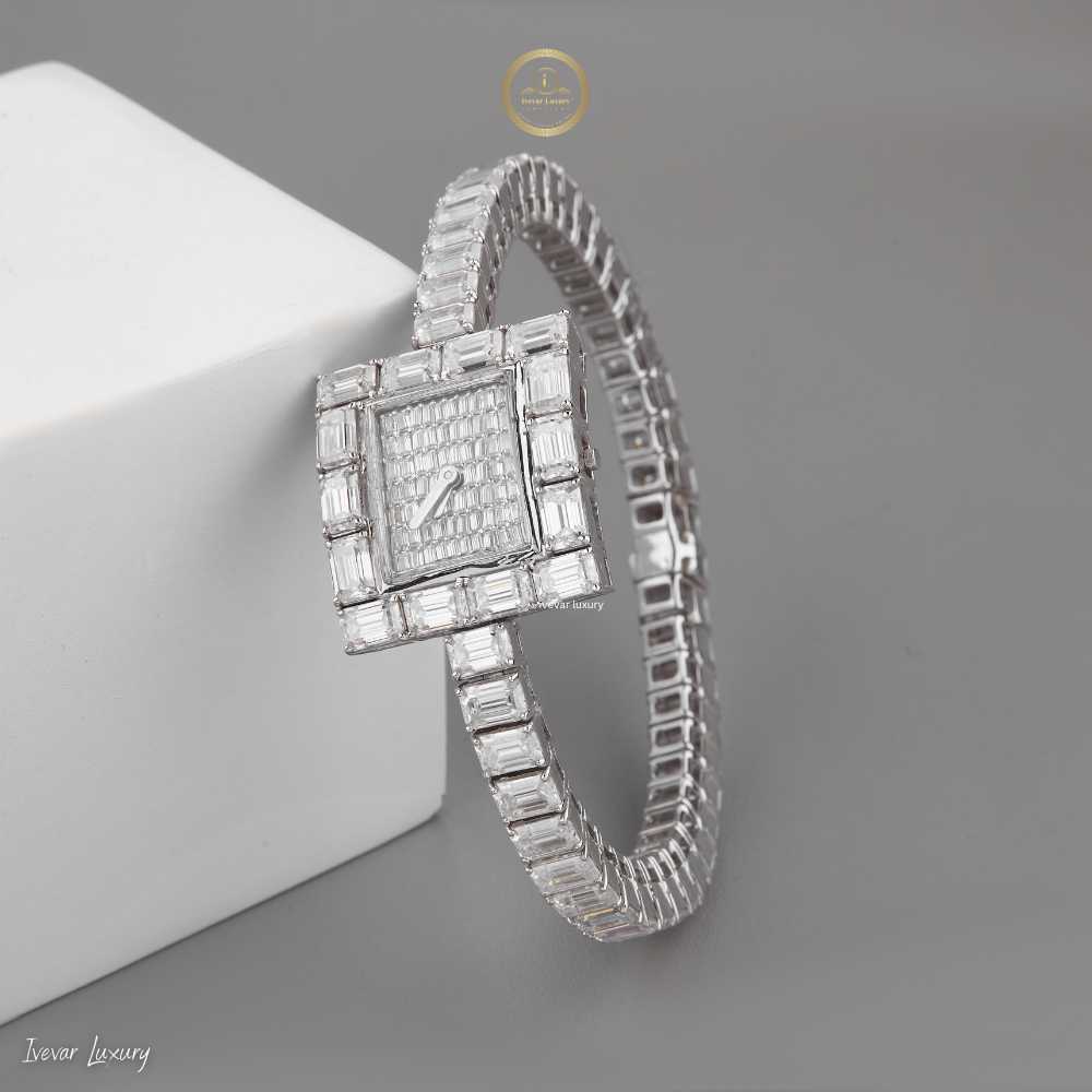 This mesmerizing lab-grown diamond watch captures the perfect harmony of geometry and brilliance. Featuring a refined square dial encrusted with baguette and emerald-cut diamonds, the design radiates symmetry, luxury, and timeless appeal. Each diamond is hand-set with precision to create a flawless, mirrored surface that reflects light from every angle. The bracelet continues the diamond pattern seamlessly, forming a continuous river of radiance around the wrist. Crafted with ethical, lab-grown diamonds, this watch celebrates sustainable opulence while maintaining the grandeur of fine haute horlogerie. Sleek, modern, and undeniably regal it’s not just a timepiece but an enduring symbol of elegance and power.
