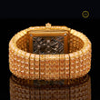 This gold Moissanite diamond watch is a masterpiece of elegance and precision, blending innovation with timeless luxury. Its bold rectangular dial reveals a glimpse of intricate mechanical detailing, framed by rows of dazzling baguette and princess-cut diamonds. Each stone is meticulously hand-set on a radiant gold base, creating a seamless glow of brilliance and sophistication. Crafted with ethical, Moissanite diamonds, it represents the perfect harmony of sustainability and opulence. Designed for those who lead with confidence and style, this watch stands as a symbol of refined power and modern prestige.