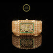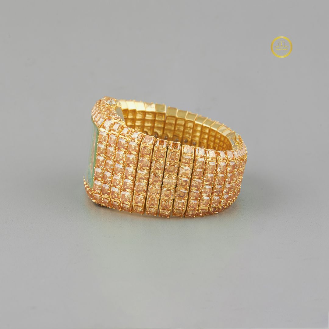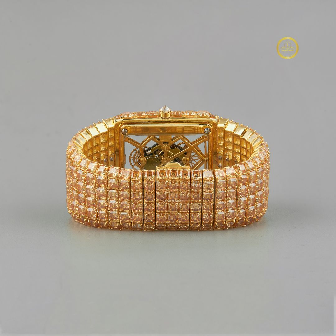 This exquisite gold Moissanite diamond watch embodies the perfect balance of artistry and grandeur. Every inch glistens with baguette cut diamonds, meticulously arranged to reflect unmatched brilliance. The rectangular dial, adorned with fine baguette detailing, showcases a glimpse of its intricate mechanical movement, symbolizing both innovation and heritage. Crafted from sustainable, ethical materials, this piece radiates the spirit of modern luxury while honoring timeless craftsmanship. Bold yet refined, it is designed for those who wear elegance as an expression of power, prestige, and purpose.