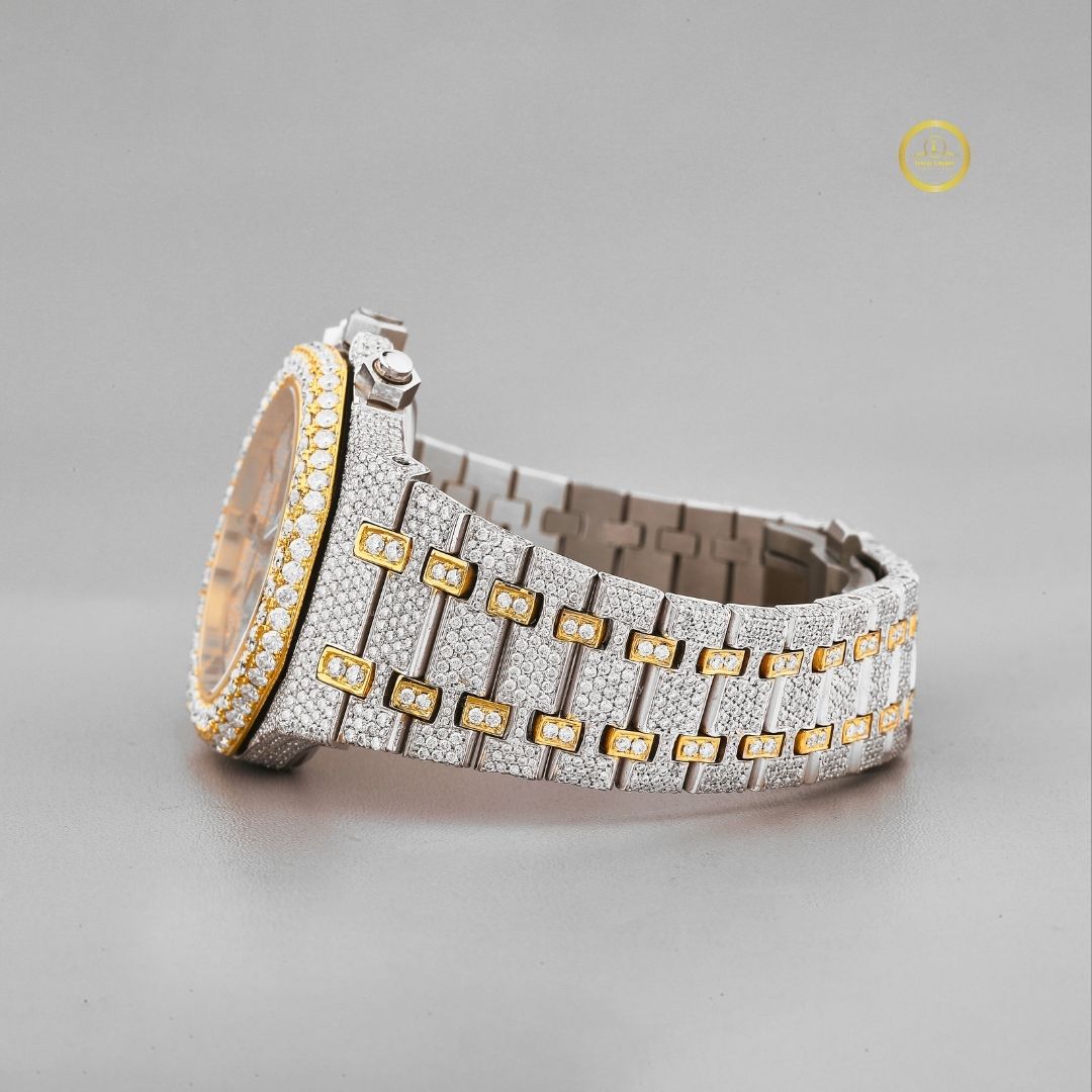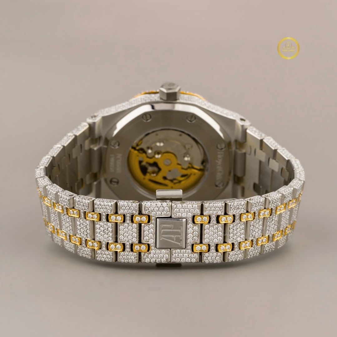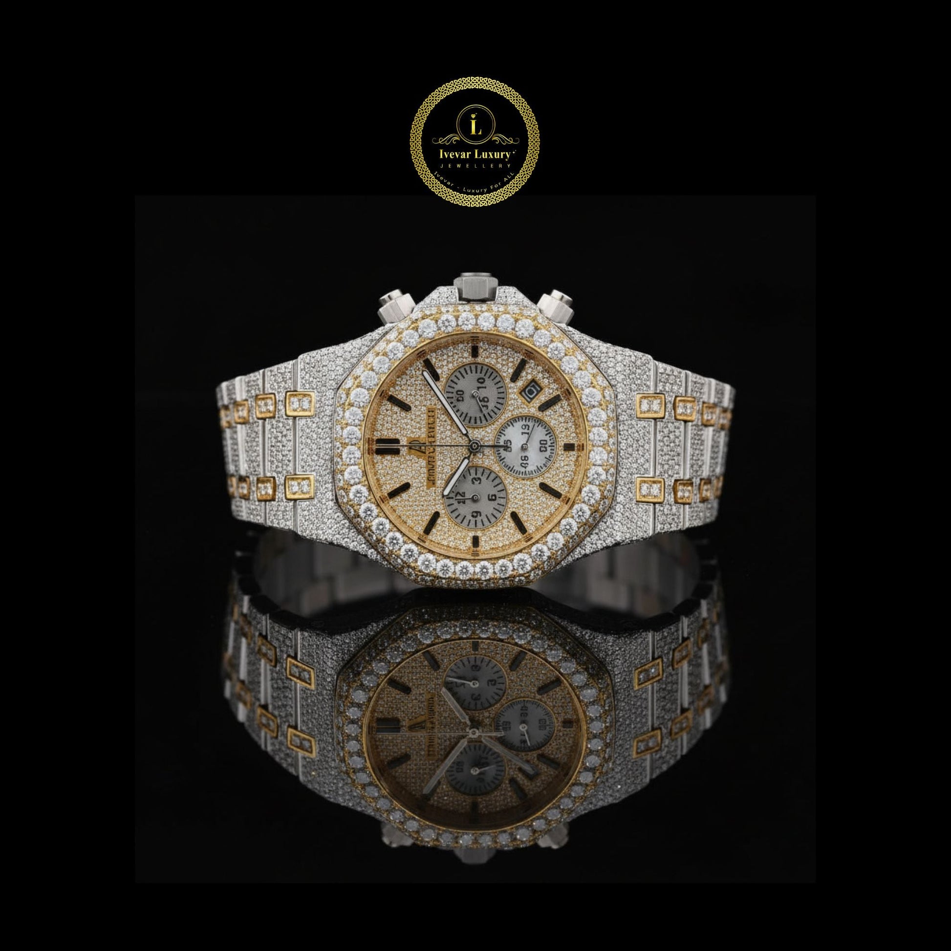 This exquisite Royal Oak Chronograph watch showcases the perfect blend of luxury, craftsmanship, and sophisticated design. The timepiece features a stunning two-tone finish of yellow gold and white gold, further elevated by an intricate diamond pavé setting across the entire case, bezel, and bracelet. The octagonal bezel, adorned with brilliant-cut diamonds, reflects the iconic Royal Oak design, making it instantly recognizable and highly coveted among collectors.