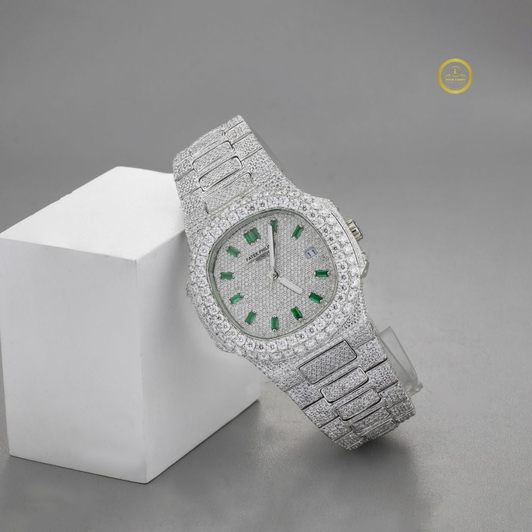 Luxury Diamond Watch – Complete Iced-Out Design with Emerald Accents for Supreme Elegance
