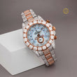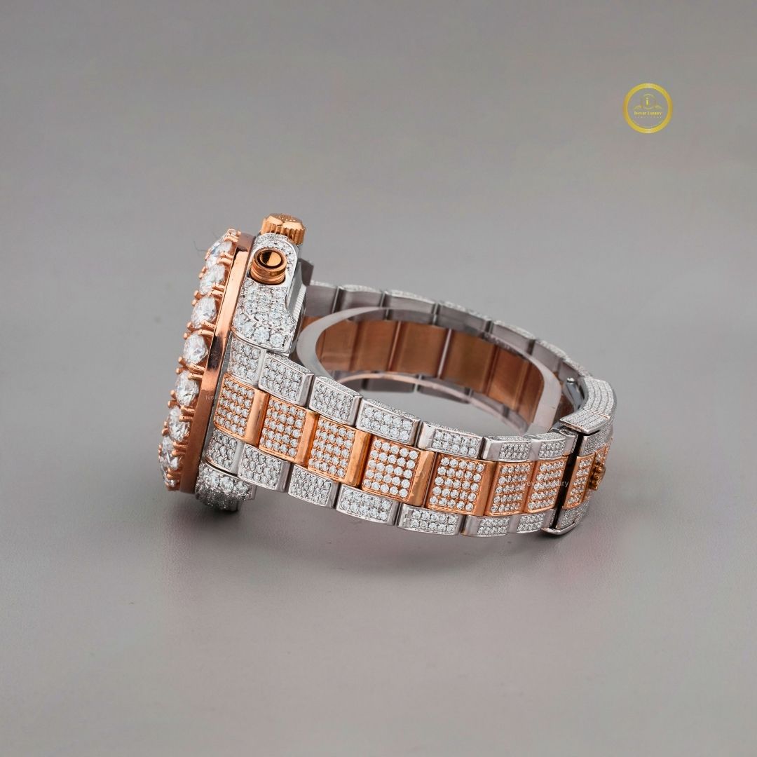 Luxurious Rose Gold and Silver Moissanite Diamond-Embellished Chronograph Watch with Intricate Pave Setting and Bold Statement Bezel