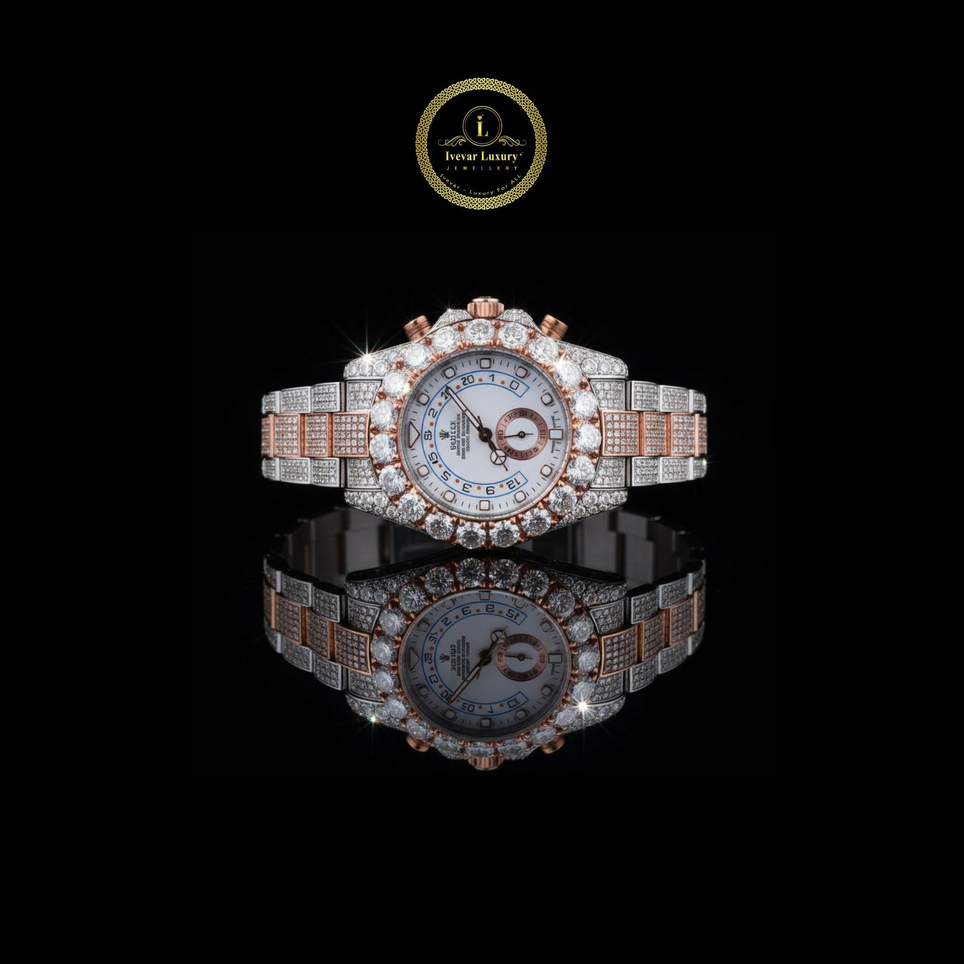 This exquisite timepiece showcases a striking blend of rose gold and silver tones, adorned with a dazzling array of brilliant round cut diamonds across the bezel, dial, and bracelet. The white dial features elegant detailing with rose-gold accents, bold hour markers, and a date display for a refined, functional touch. The bezel, encrusted with large round diamonds, adds a radiant frame that enhances the watch’s luxurious allure. Meticulously crafted by Ivevar Luxury for those who appreciate fine artistry and timeless sophistication, this watch embodies the perfect fusion of elegance, power, and prestige.
