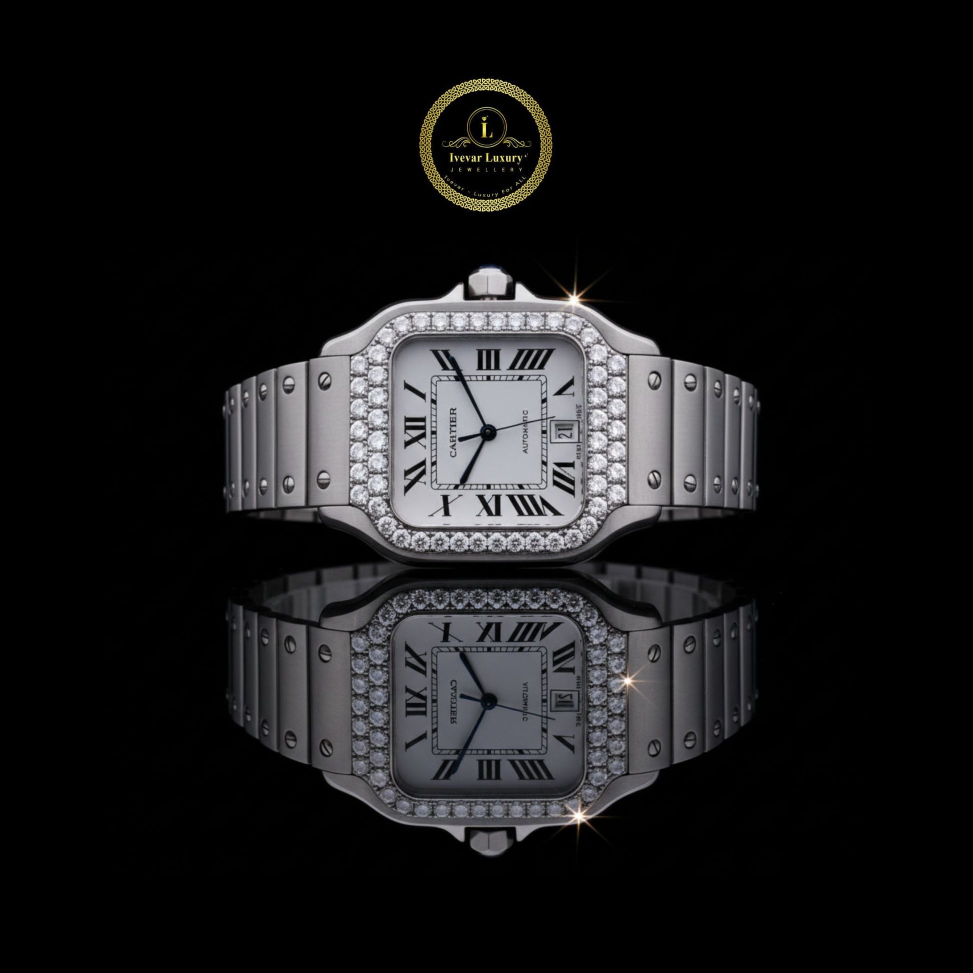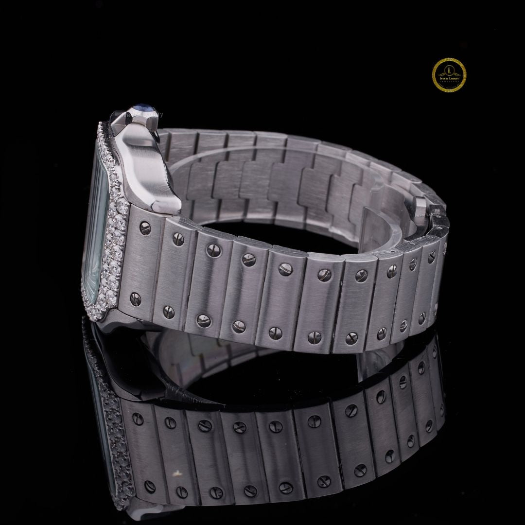 This refined luxury watch embodies a perfect harmony of classic design and modern craftsmanship. The stainless-steel case and bracelet offer a sleek, durable finish, while the diamond-set bezel adds a touch of radiant brilliance that enhances its timeless appeal. The white dial features bold black Roman numerals and elegant blue-toned hands, exuding sophistication and clarity. Designed for those who appreciate understated elegance, this timepiece captures the essence of luxury, precision, and enduring style — a statement piece that reflects true refinement and confidence.