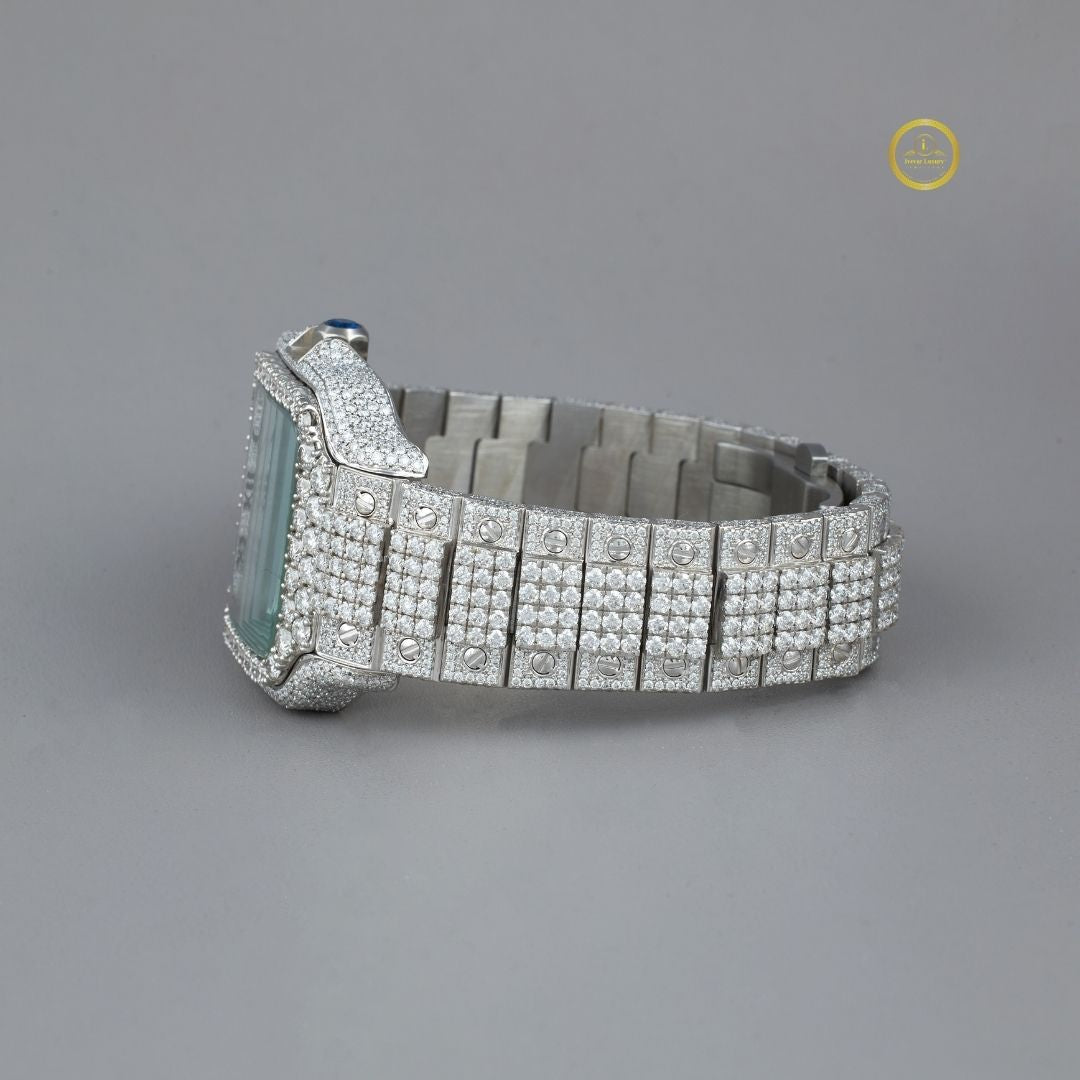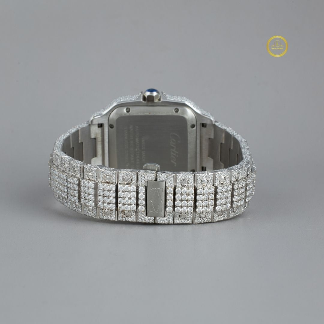 This masterfully crafted luxury wristwatch is a true symbol of sophistication and prestige. Designed with a fully diamond-encrusted bezel and bracelet, it radiates unmatched brilliance and allure. The silver-tone dial showcases bold Roman numeral hour markers and sleek blue-toned hands, reflecting a perfect blend of classic artistry and modern precision.