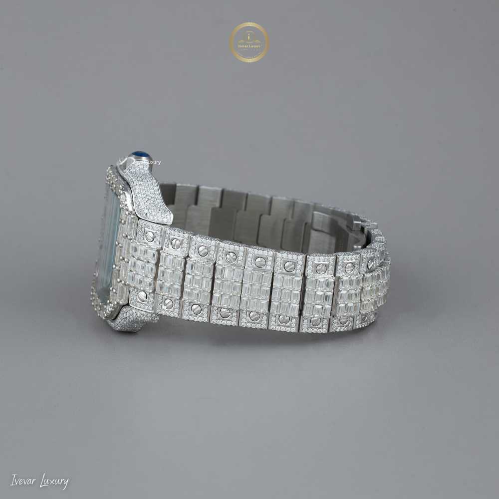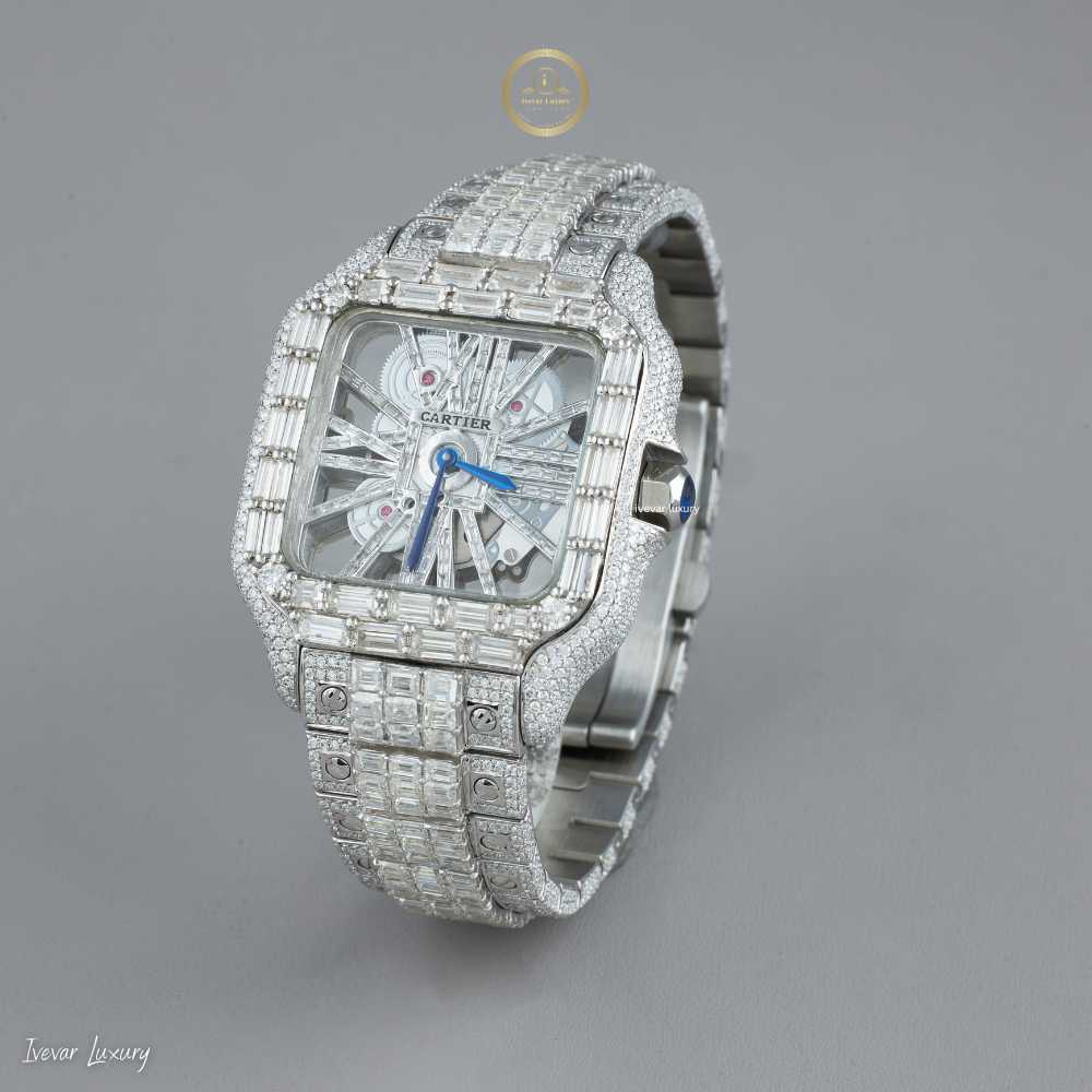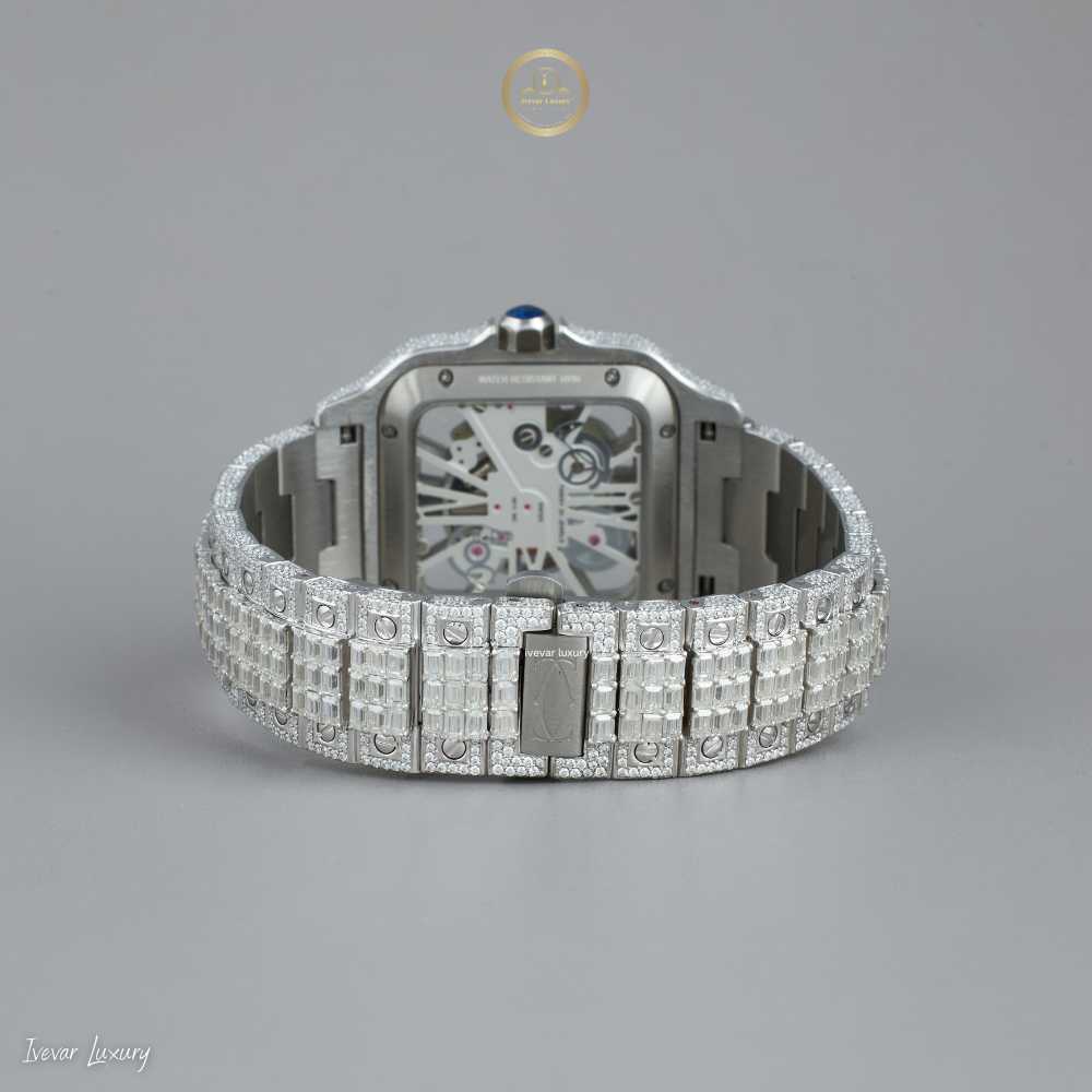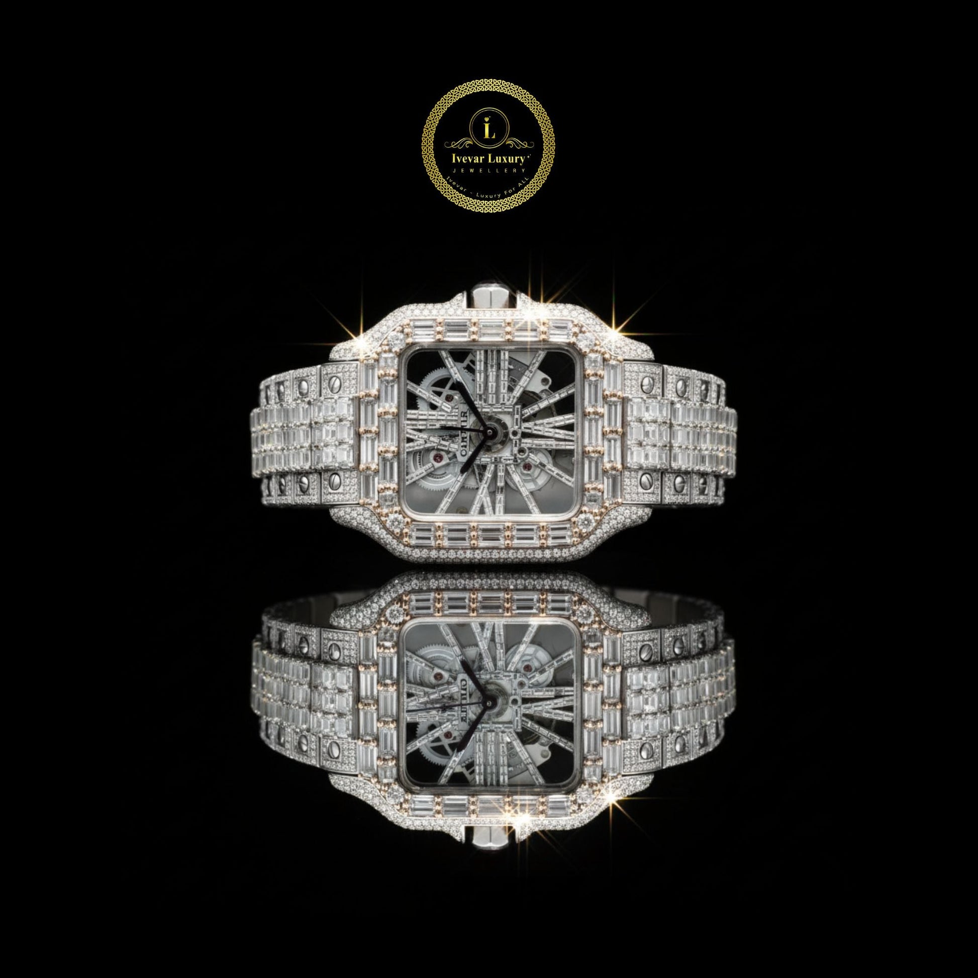 Luxurious Skeleton Moissanite Diamond Timepiece with Baguette-Cut Detailing and Transparent Mechanical Design