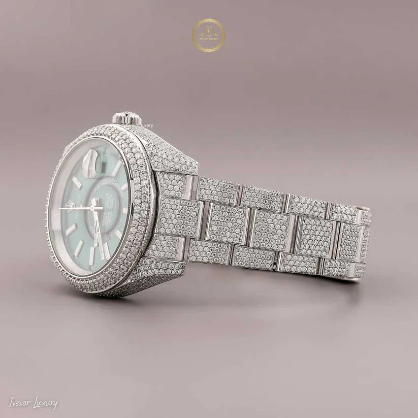 A masterpiece of elegance and craftsmanship, this Emerald Green Color Dial Diamond-Encrusted Luxury Watch radiates sophistication and power. The vibrant green dial is framed by a fully iced-out watch, featuring meticulously set round-cut diamonds that exude brilliance from every angle in silver finish. Its luminous markers and date display add both style and functionality, making it a statement accessory for the modern connoisseur of luxury.