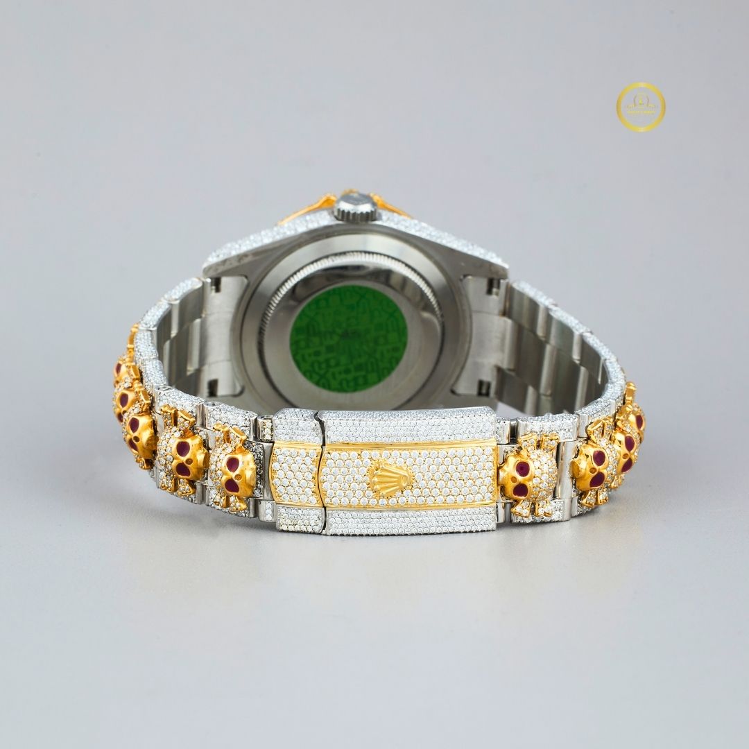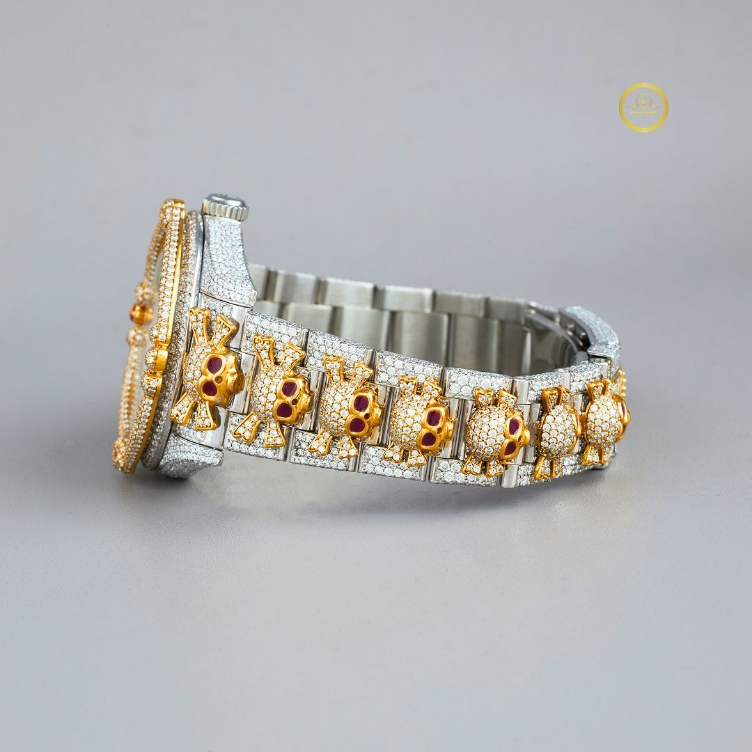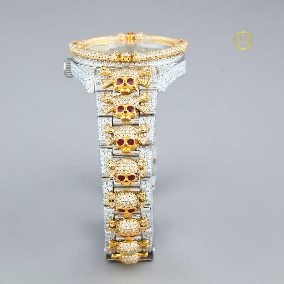 This luxurious timepiece is a dazzling masterpiece, crafted with meticulous attention to detail and elegance. The watch features a fully diamond-encrusted case and bracelet accented with radiant gold tones and striking bow-shaped links, exuding opulence and sophistication. Its golden dial is adorned with pink baguette-cut hour markers and a playful, artistic motif at the center, adding a unique charm to its design. Completed with a date display and a shimmering pavé finish, this watch is the epitome of high-end craftsmanship, blending glamour, creativity, and timeless luxury in perfect harmony by Ivevar.