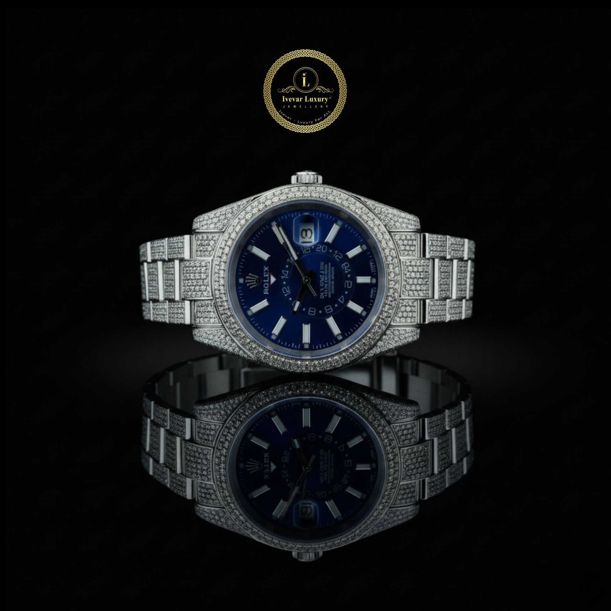 Bold, elegant, and undeniably captivating, this White Gold Fully Iced-Out Diamond Timepiece merges horological excellence with high jewelry artistry. The deep sapphire-blue dial serves as a striking contrast to the dazzling brilliance of meticulously hand-set round diamonds adorning the bezel, case, and bracelet. Every detail reflects precision and prestige — from the refined hour markers to the seamless pavé craftsmanship that radiates luxury from every angle. Designed for those who command sophistication and presence, this watch embodies timeless elegance, exceptional craftsmanship, and the ultimate expression of opulent style.