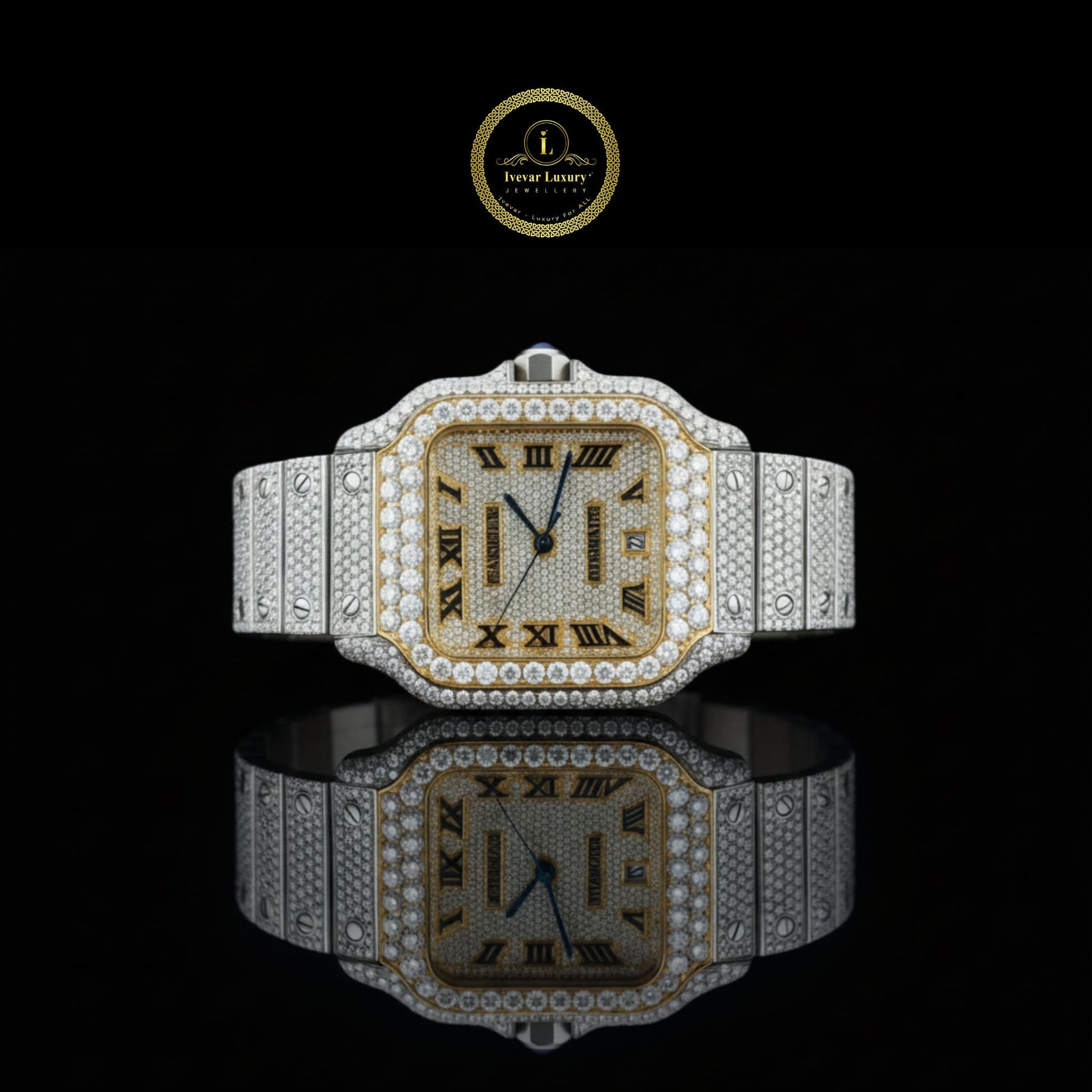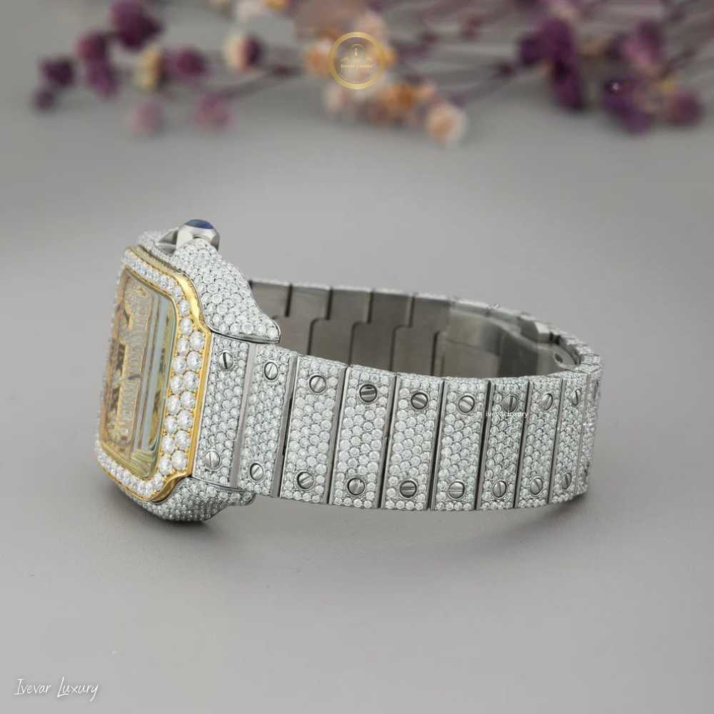 This luxury diamond timepiece is a true celebration of artistry and excellence. The gold-accented dial, framed by a halo of dazzling round-cut diamonds, radiates an aura of royal confidence and refined taste.