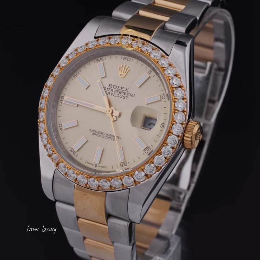 This elegant two-tone luxury watch exudes timeless sophistication, featuring a refined blend of stainless steel and yellow gold throughout its bracelet and bezel. The bezel is beautifully adorned with round-cut diamonds, adding a touch of brilliance that complements its sleek champagne dial. Bold hour markers and a date display at the 3 o’clock position enhance both its style and functionality. Ivevar Designes for those who appreciate understated opulence and classic design, this timepiece perfectly balances luxury and everyday wearability.