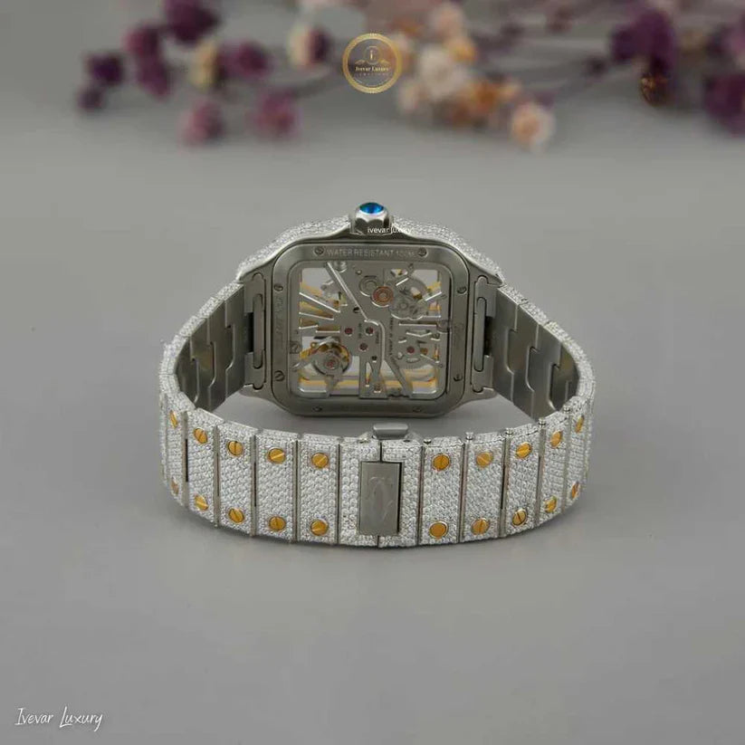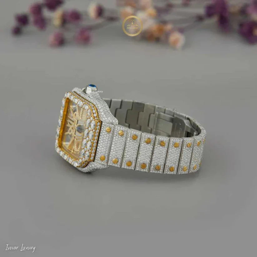 A creation that defines grandeur and precision, this skeleton diamond timepiece showcases the essence of luxury craftsmanship. The gold-toned skeleton dial, framed by a diamond-studded bezel, reveals the intricate mechanical movement beneath — a marvel of engineering beauty and artistic mastery.