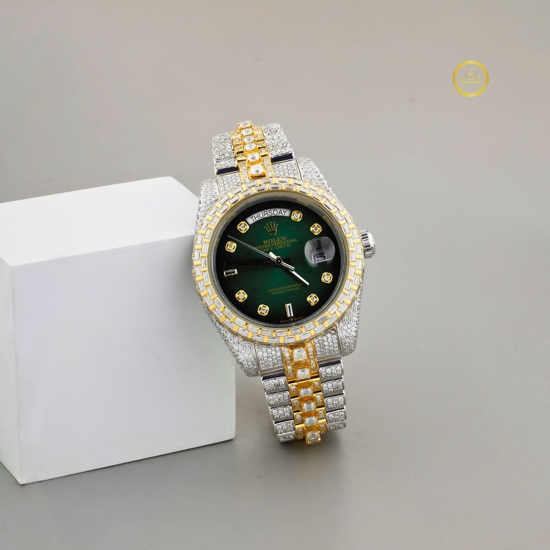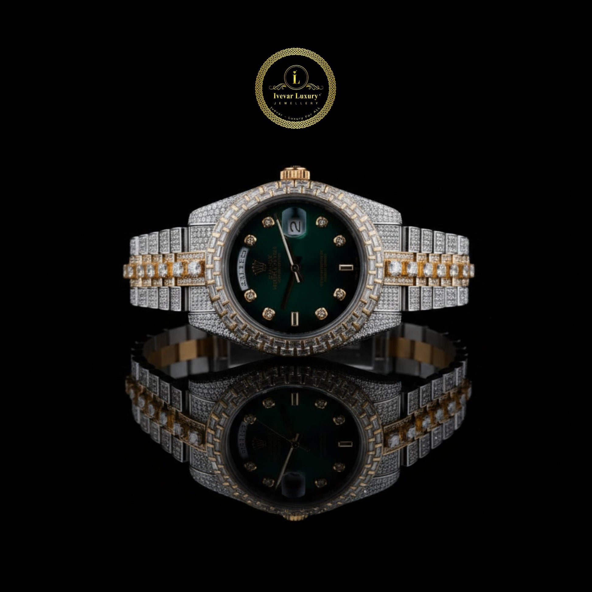 This magnificent luxury watch radiates sophistication and power, featuring a deep emerald green dial that contrasts beautifully with its gold and silver diamond-encrusted design. The dial is adorned with brilliant-cut diamond hour markers and a date display, exuding timeless elegance. Surrounding the face is a meticulously set baguette diamond bezel that enhances its refined brilliance, while the bracelet showcases alternating gold and diamond patterns for a flawless, high-end finish. Crafted with precision and style, this timepiece embodies modern luxury and classic prestige in perfect harmony by Ivevar.