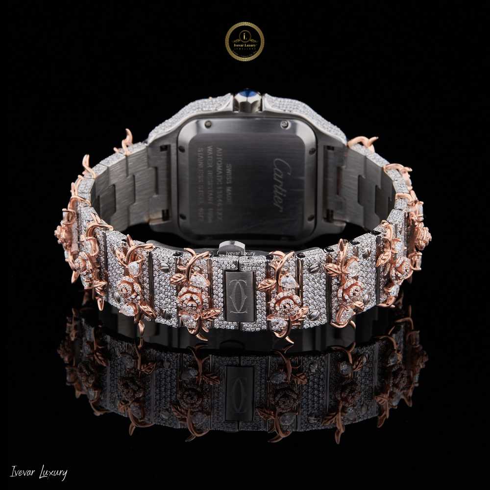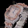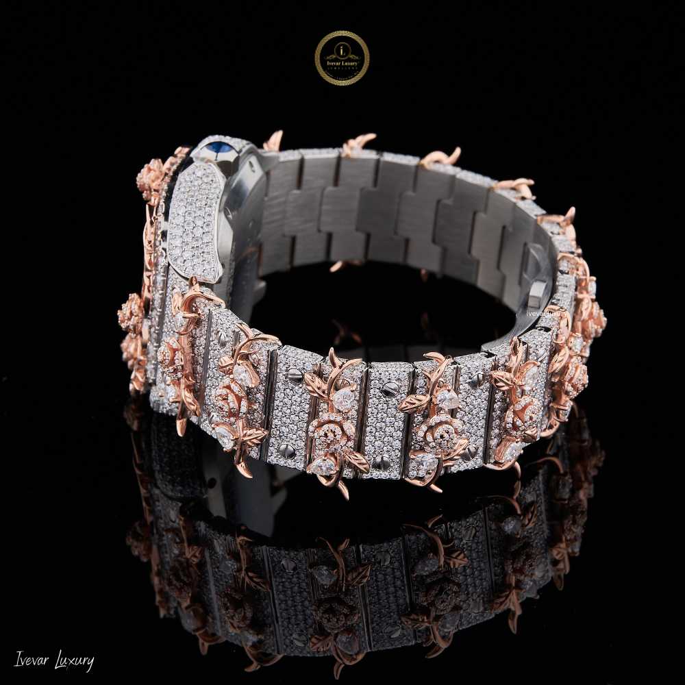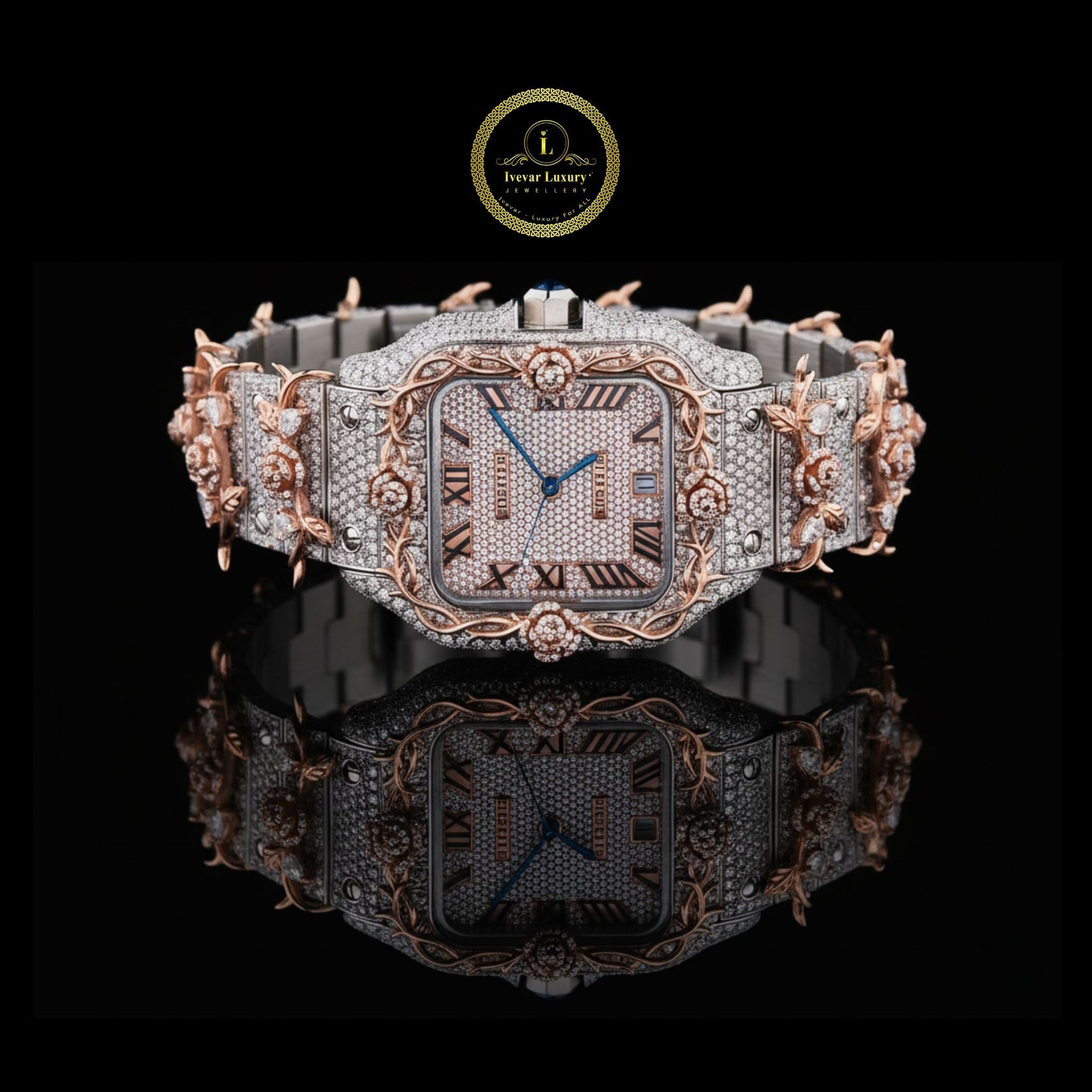 Step into the world of opulent craftsmanship and unmatched sophistication with this fully diamond-paved timepiece, designed for those who command attention with every move. The square dial, framed with brilliant-cut diamonds and intricate rose-gold floral detailing, reflects a perfect harmony between art and precision engineering.