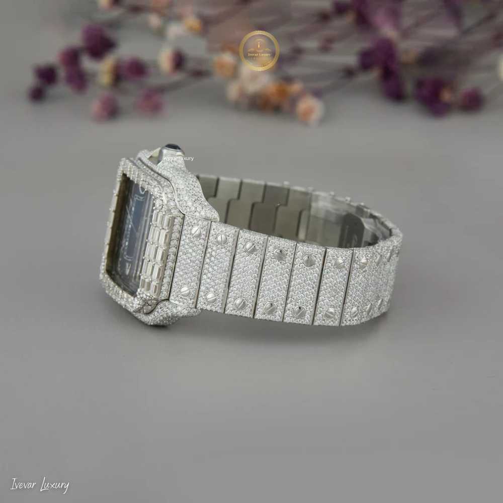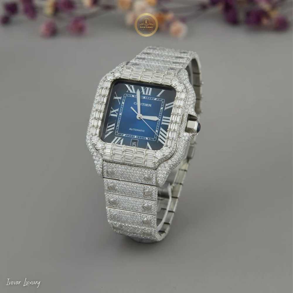 This diamond-encrusted luxury timepiece embodies the perfect union of strength and sophistication. The deep sapphire-blue dial, surrounded by a frame of flawless baguette and round-cut diamonds, radiates a captivating aura of prestige and precision.
