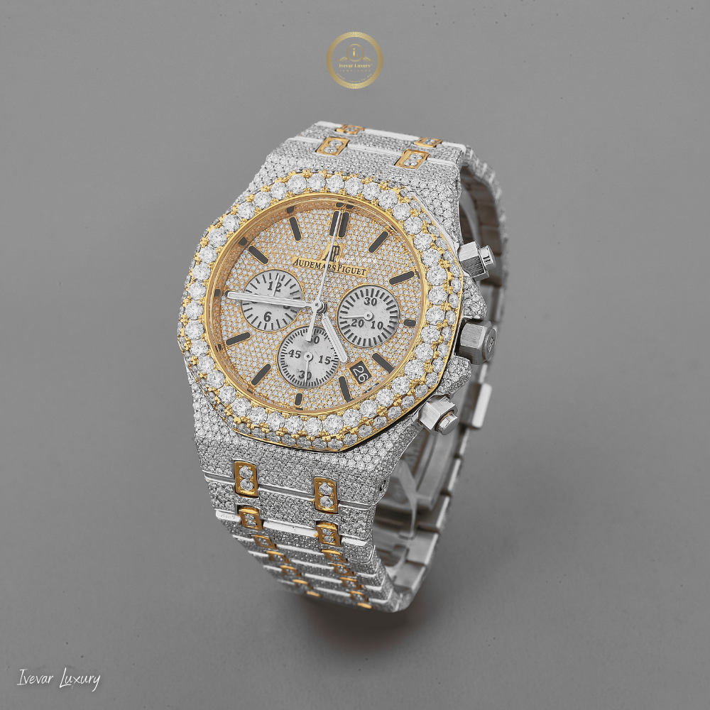 This exquisite Royal Oak Chronograph watch showcases the perfect blend of luxury, craftsmanship, and sophisticated design. The timepiece features a stunning two-tone finish of yellow gold and white gold, further elevated by an intricate diamond pavé setting across the entire case, bezel, and bracelet. The octagonal bezel, adorned with brilliant-cut diamonds, reflects the iconic Royal Oak design, making it instantly recognizable and highly coveted among collectors.
