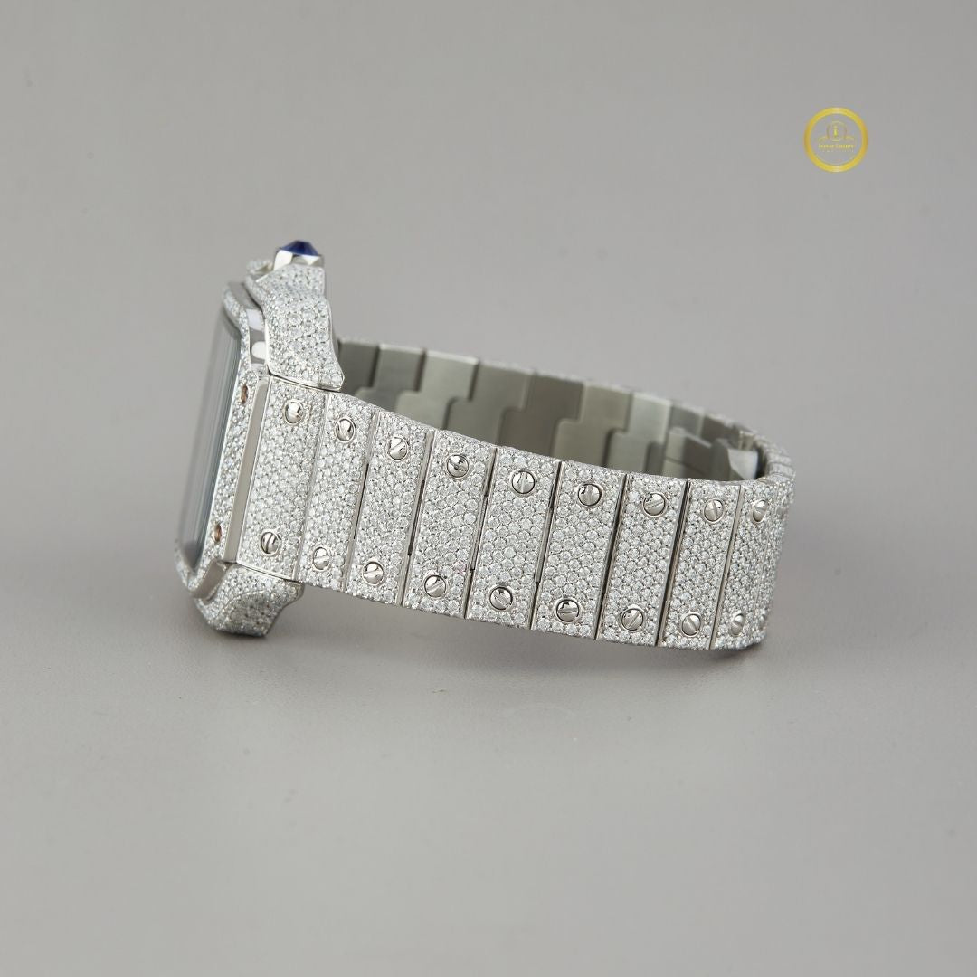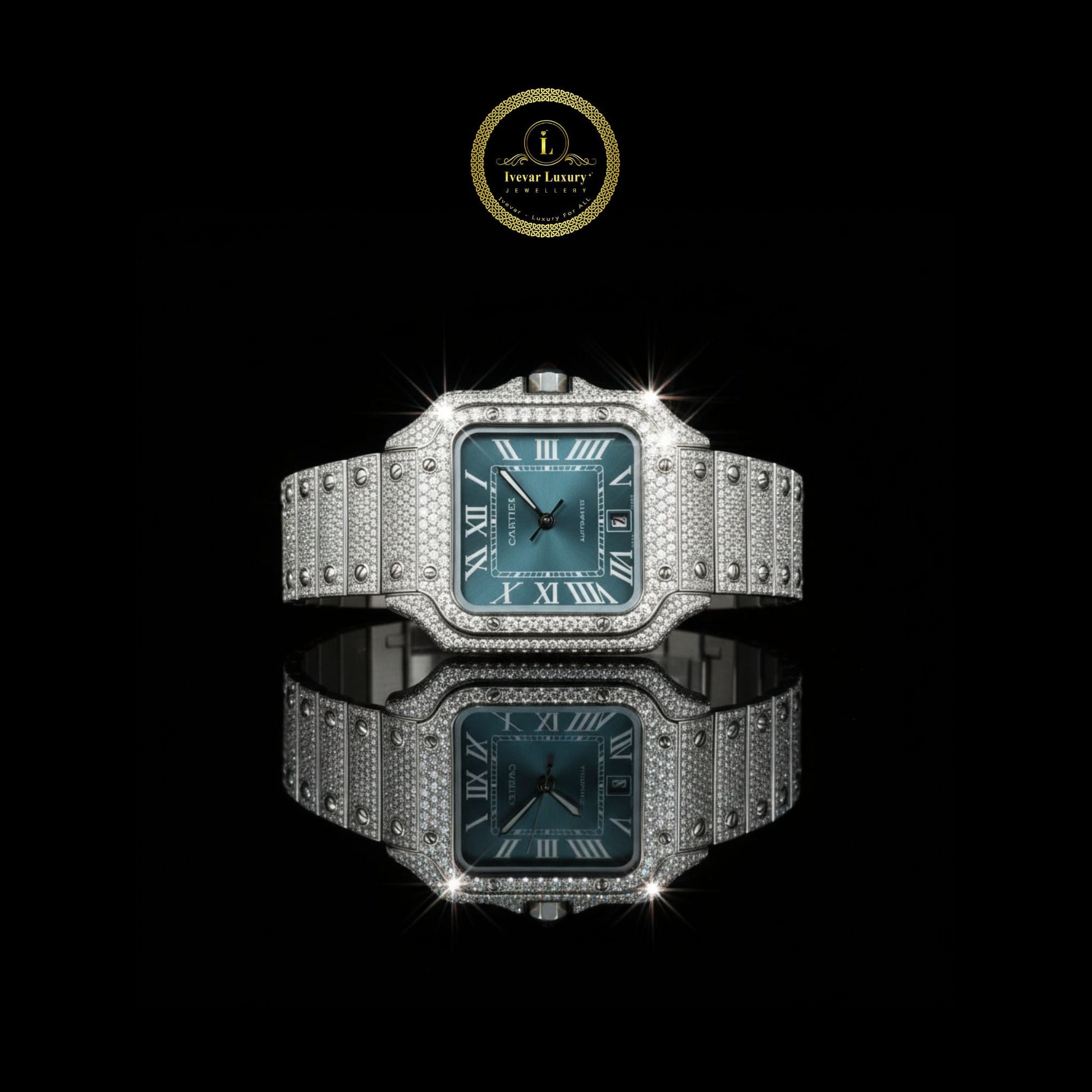 This exquisite luxury watch redefines sophistication with its aqua blue Roman dial, radiating a serene yet powerful presence. The square-shaped case and bracelet are fully adorned with meticulously set diamonds, creating a mesmerizing sparkle from every angle. The polished silver tones highlight the brilliance of each stone, while the sleek Roman numerals and precision-cut hands reflect refined craftsmanship. Designed for those who appreciate grace, opulence, and precision, this timepiece stands as a true symbol of modern elegance and everlasting allure.