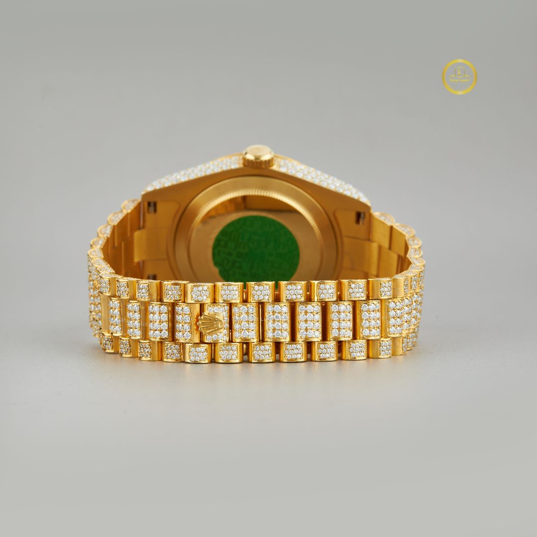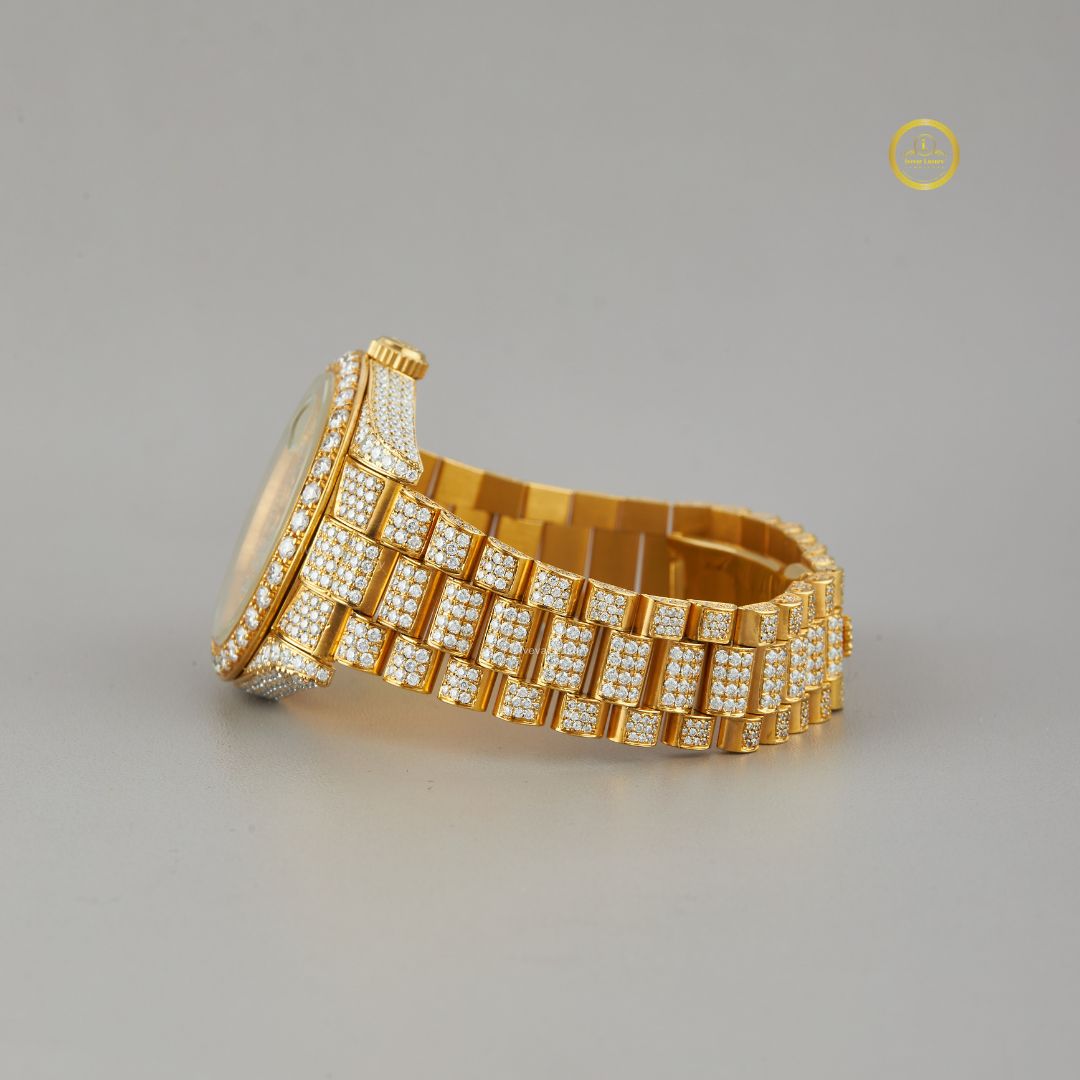 An extraordinary creation of brilliance and prestige, this Exquisite Yellow Gold Fully Iced-Out Diamond Timepiece epitomizes the art of luxury watchmaking. Every surface—from the meticulously pavé-set dial to the dazzling round diamond-encrusted bezel and bracelet—radiates unmatched opulence and craftsmanship. The warm glow of yellow gold enhances the luminous sparkle of each hand-set diamond, creating a captivating harmony of light and elegance. Designed for the connoisseur who commands attention, this timepiece unites precision engineering with high jewelry artistry, standing as a true symbol of power, sophistication, and timeless allure.