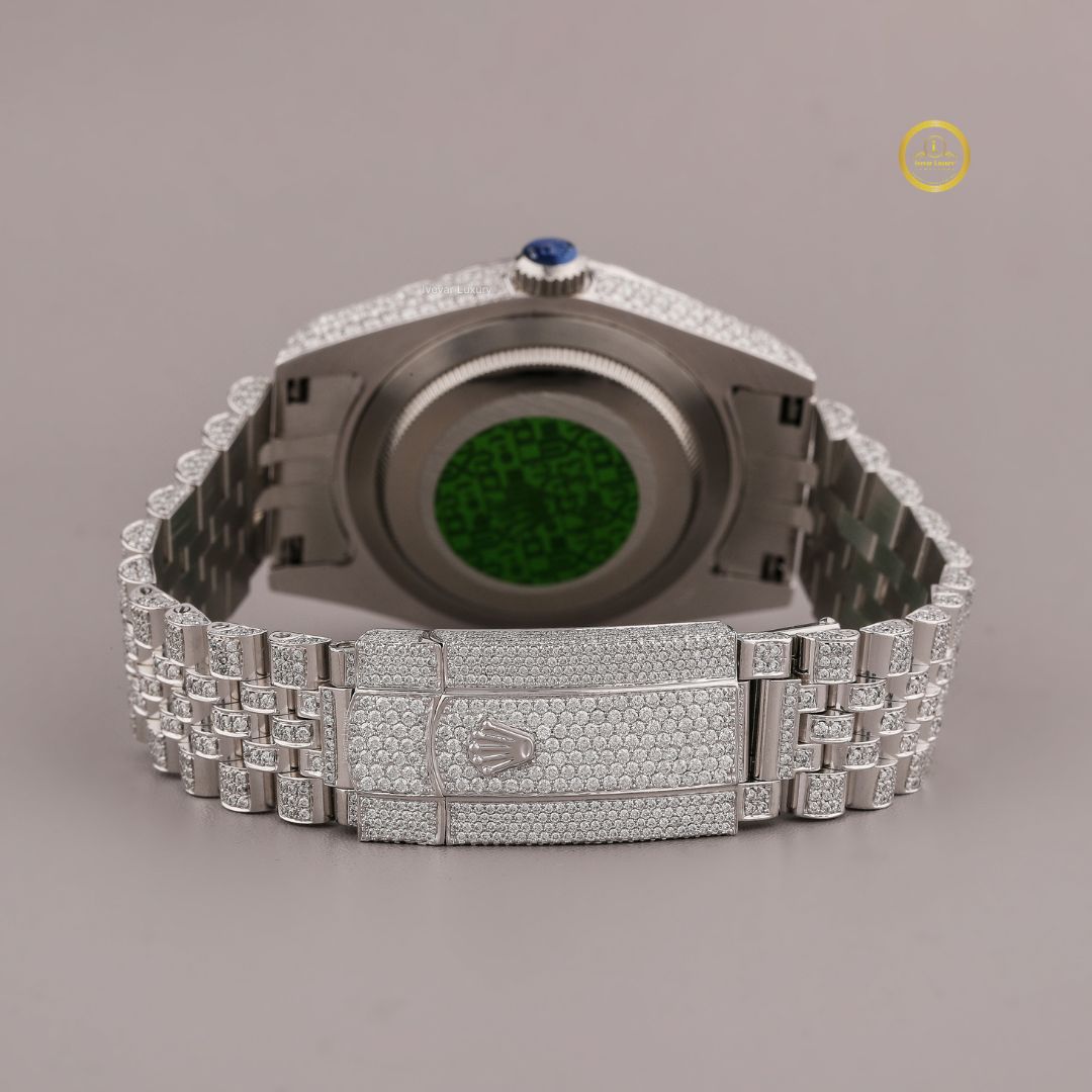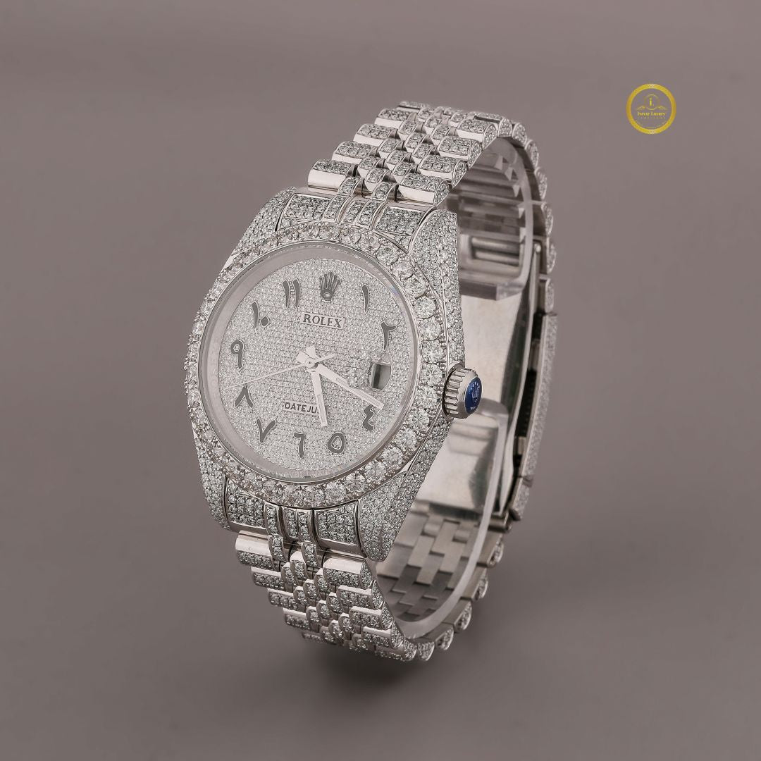 This stunning all-silver diamond watch radiates modern elegance and luxury. The entire case and dial are meticulously paved with shimmering round-cut diamonds, creating a breathtaking full-ice effect. Its dial features distinctive Arabic numeral hour markers, blending cultural charm with contemporary sophistication. A date display a time and precision craftsmanship complete the design, making it an exceptional statement piece for Ivevar luxury collection.