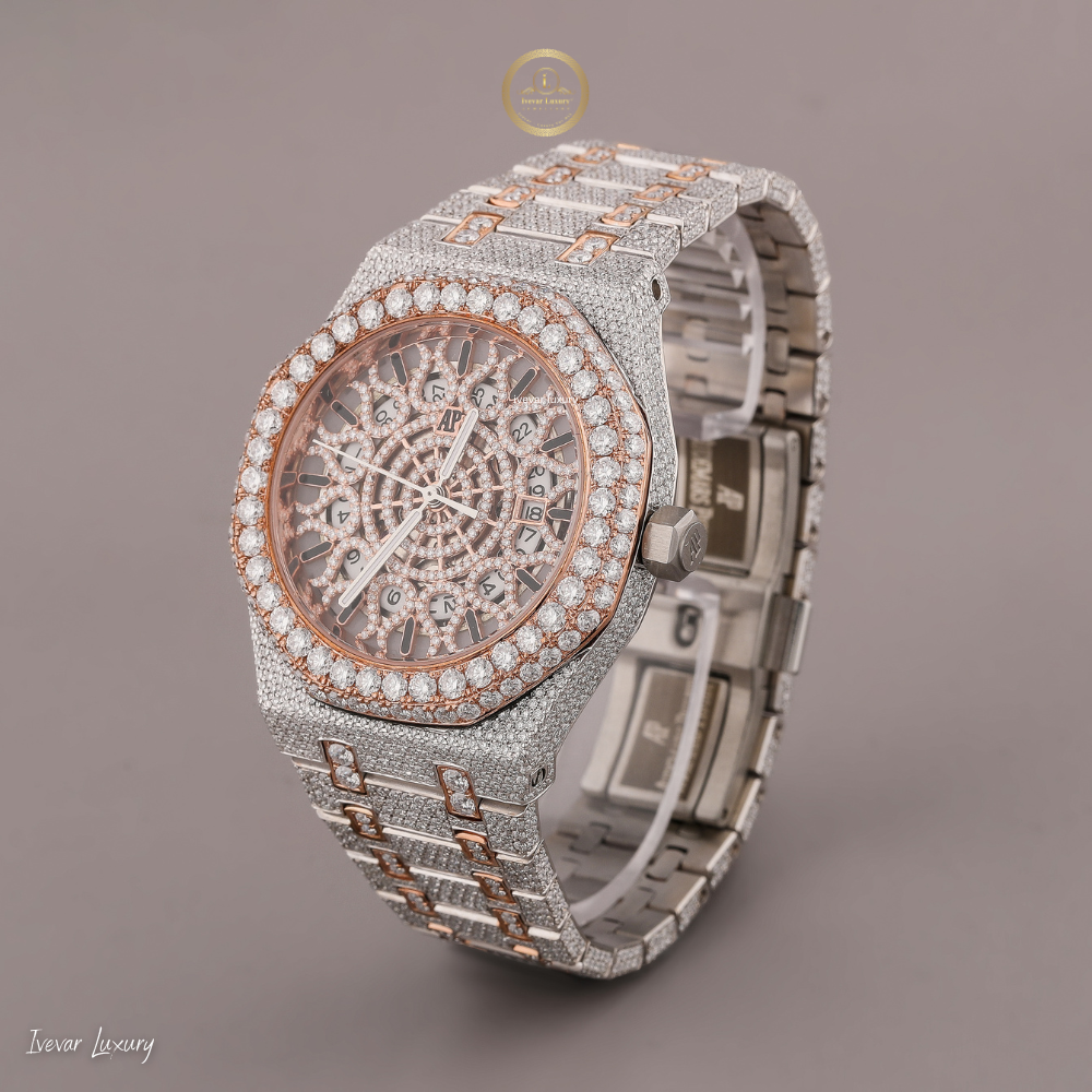 This magnificent luxury wristwatch represents the pinnacle of refined craftsmanship and extravagant design. The piece showcases a stunning skeleton dial that reveals intricate mechanical artistry, surrounded by a lavish array of brilliant-cut diamonds meticulously set across the bezel, case, and bracelet. The octagonal bezel, framed with alternating rose gold and white diamonds, radiates elegance and prestige.