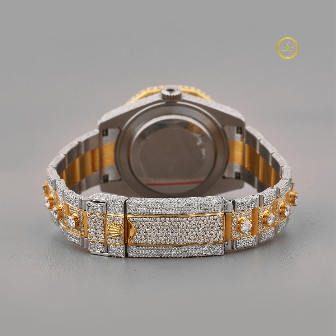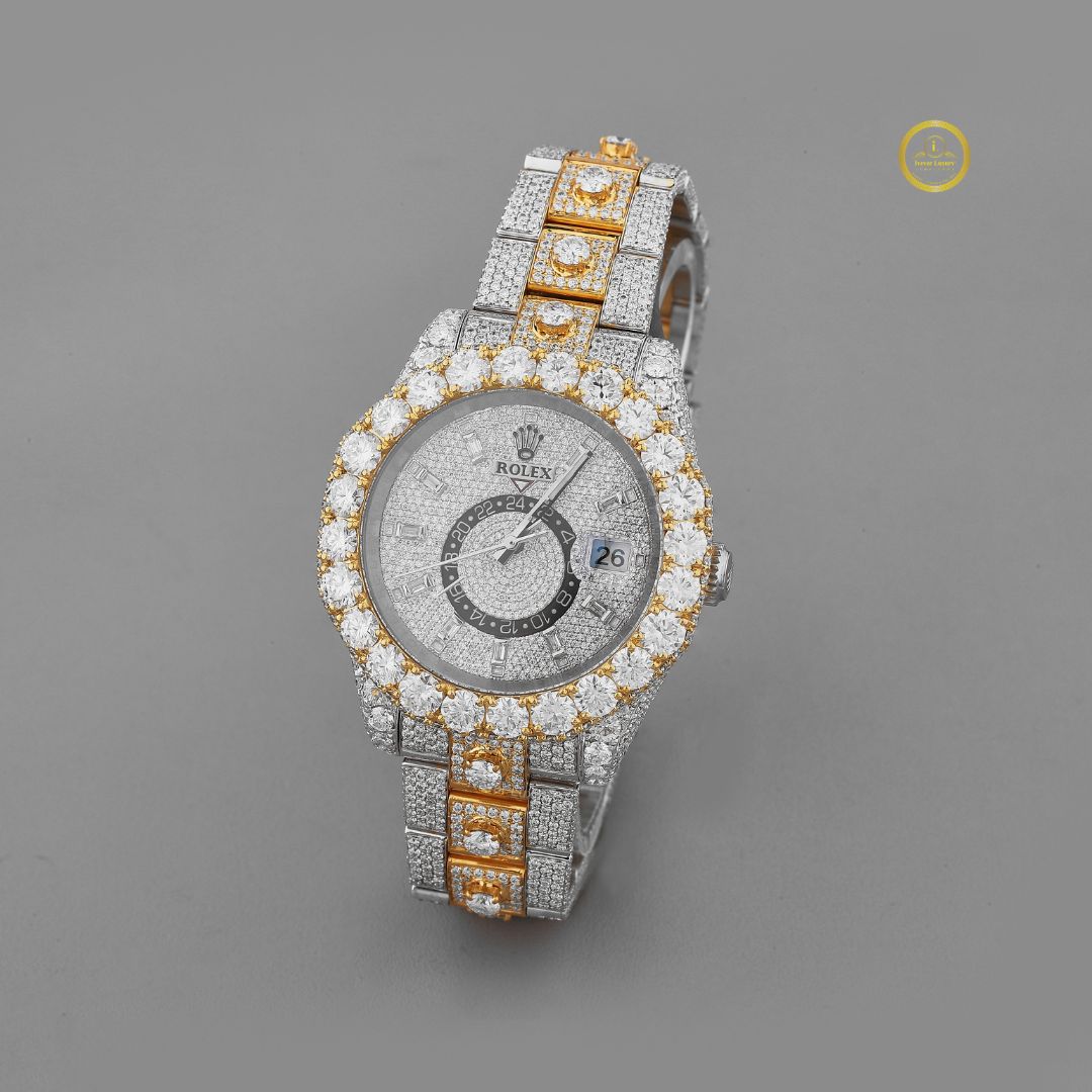 Radiating pure grandeur, this Two-Tone Diamond Bezel Luxury Watch is a masterpiece of brilliance and craftsmanship. The watch features an intricately paved silver dial, surrounded by a bold round bezel adorned with large round-cut diamonds. Gold accents along the bracelet add a rich contrast to the fully diamond-encrusted design, creating a striking two-tone aesthetic. Complete with a date display and precision detailing, this timepiece is the ultimate expression of prestige and modern opulence.