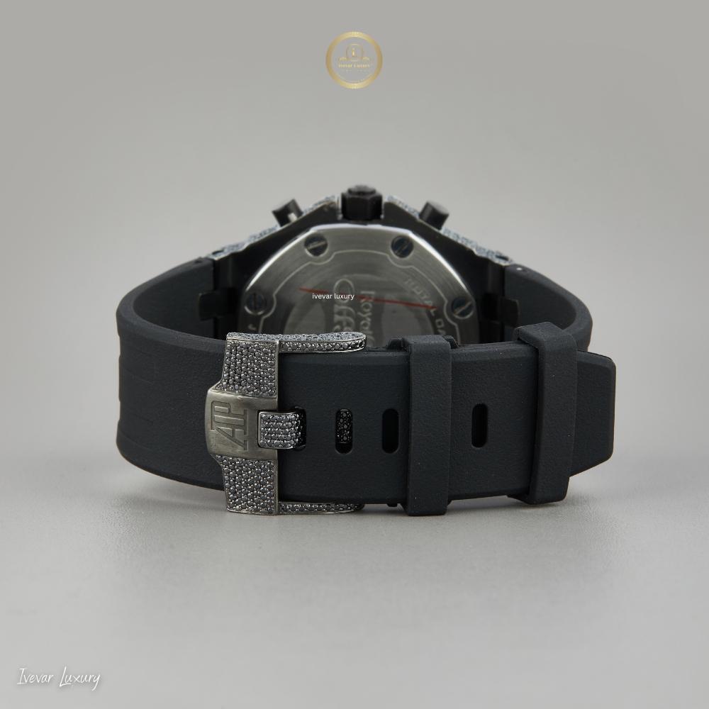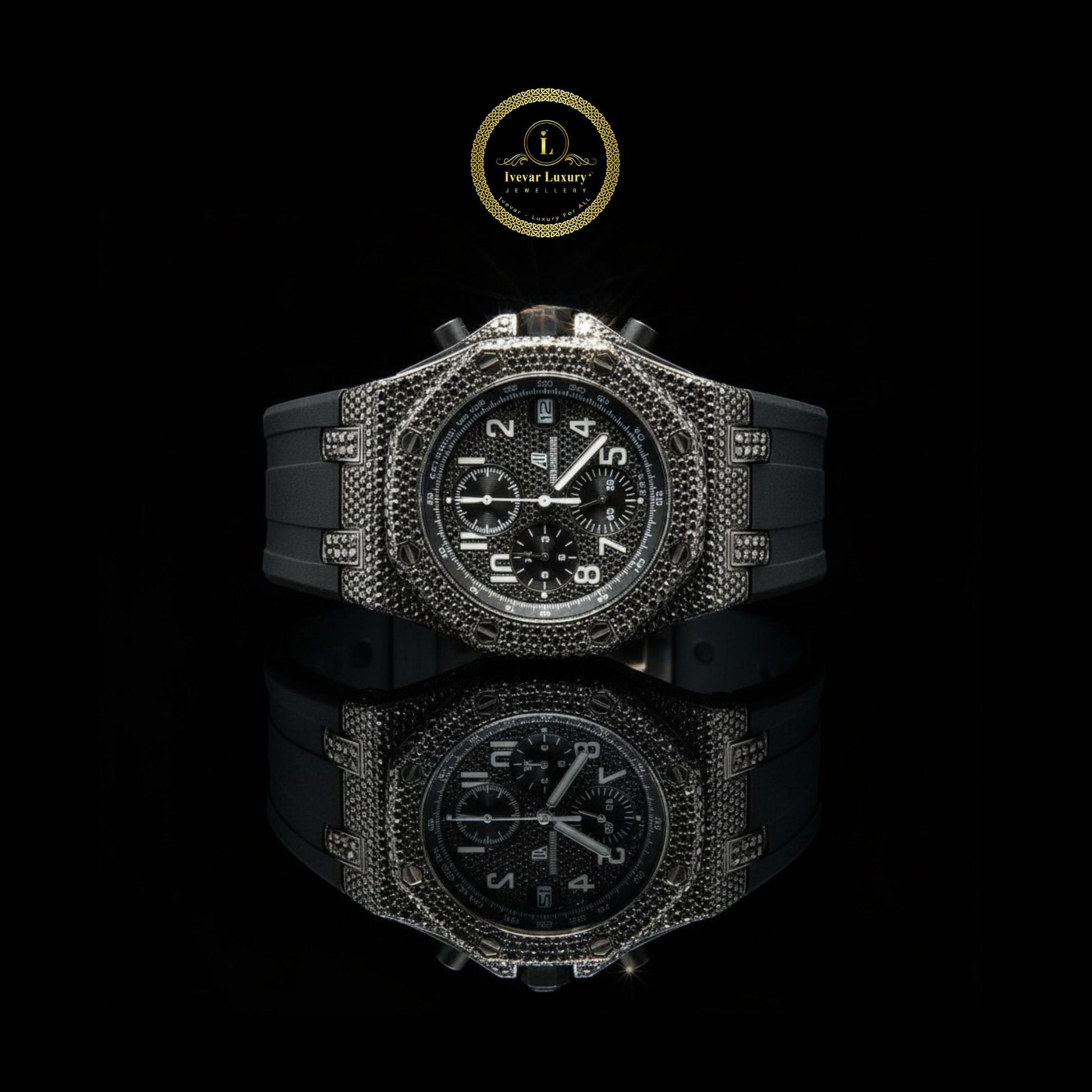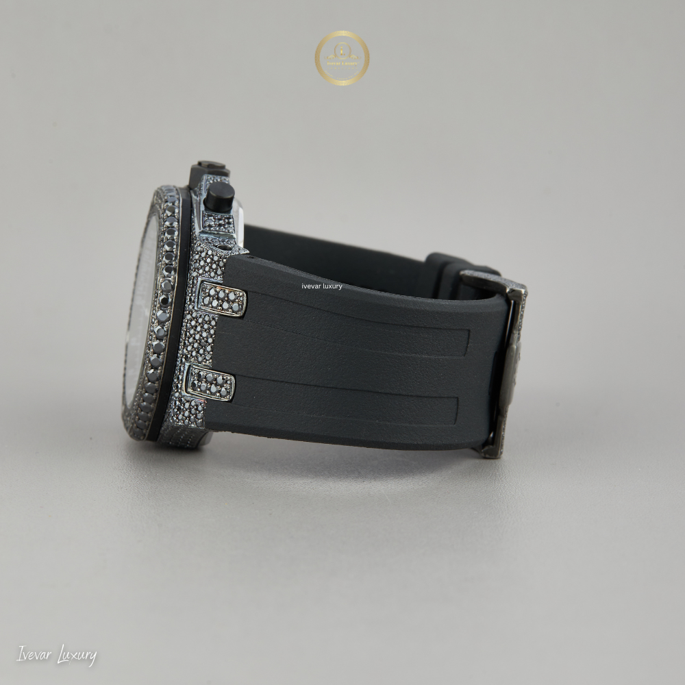 This bold luxury watch combines sporty design with elegant craftsmanship, featuring a black diamond-encrusted bezel that adds a touch of refined sophistication. The chronograph functionality ensures precision timekeeping, while the matte black strap offers both comfort and durability. Designed for those who value performance and style, this timepiece makes a powerful statement of confidence and exclusivity.