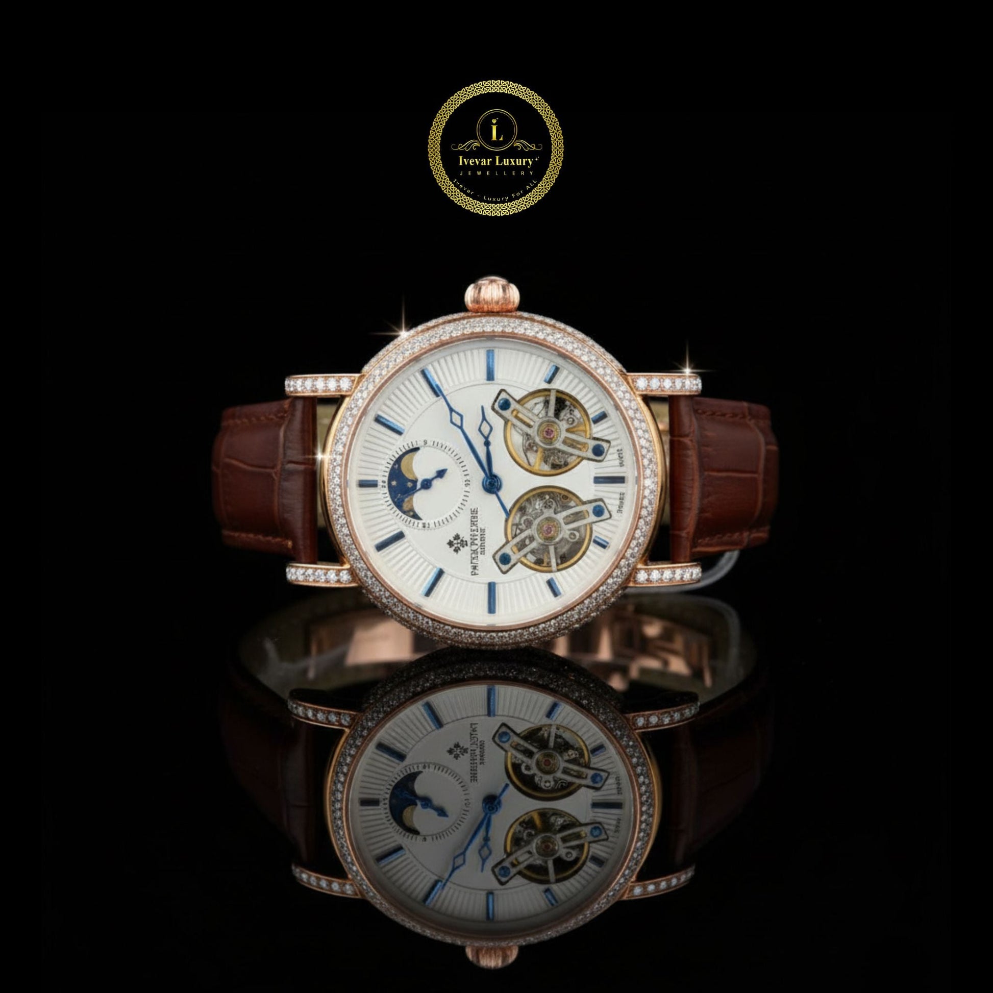 Experience timeless elegance with the Ivevar Luxury watch, a perfect blend of artistry and precision. Crafted with a stunning rose gold case accented with sparkling diamonds, this timepiece exudes sophistication. The intricate dial features dual tourbillon mechanisms, showcasing the exceptional Swiss craftsmanship and engineering behind its design.