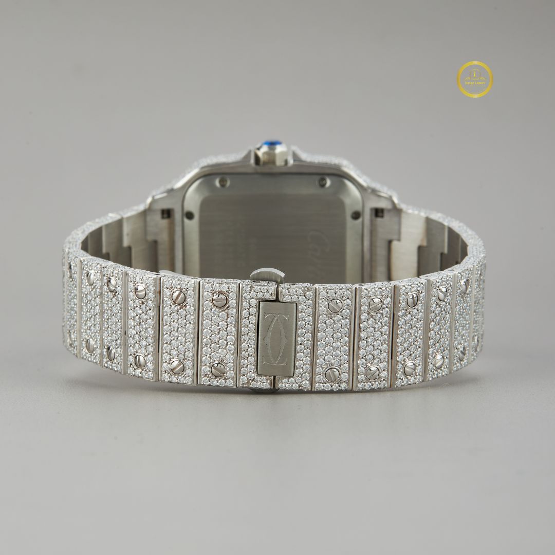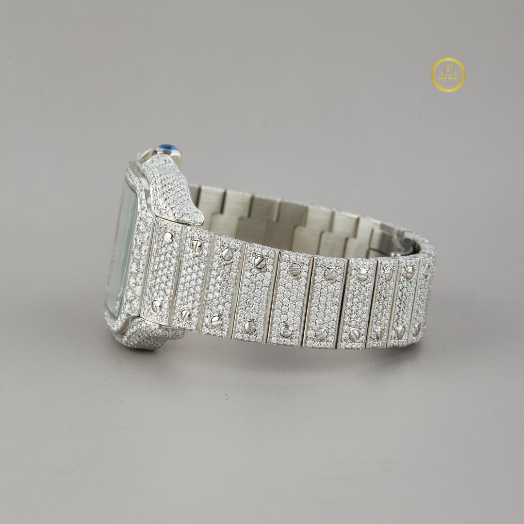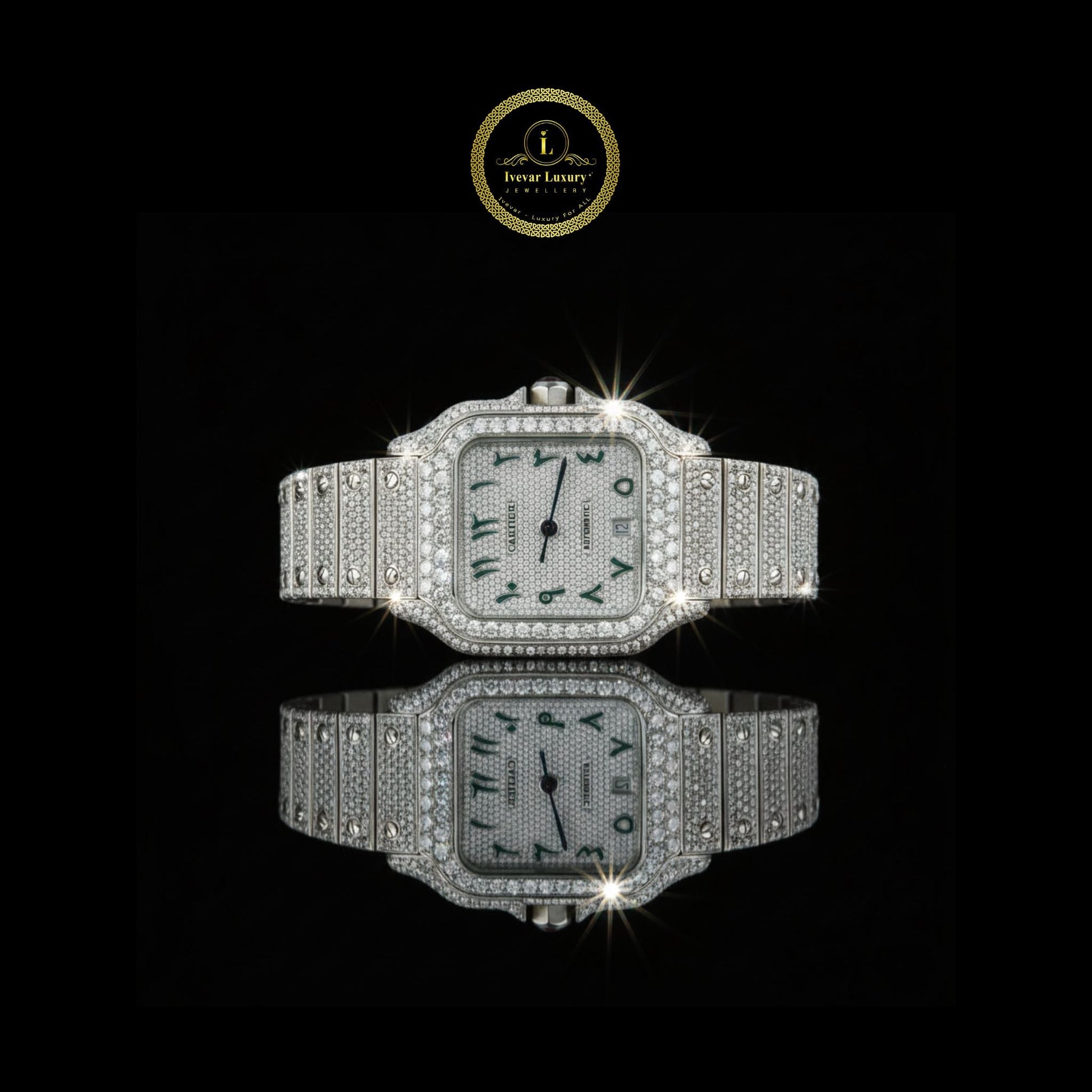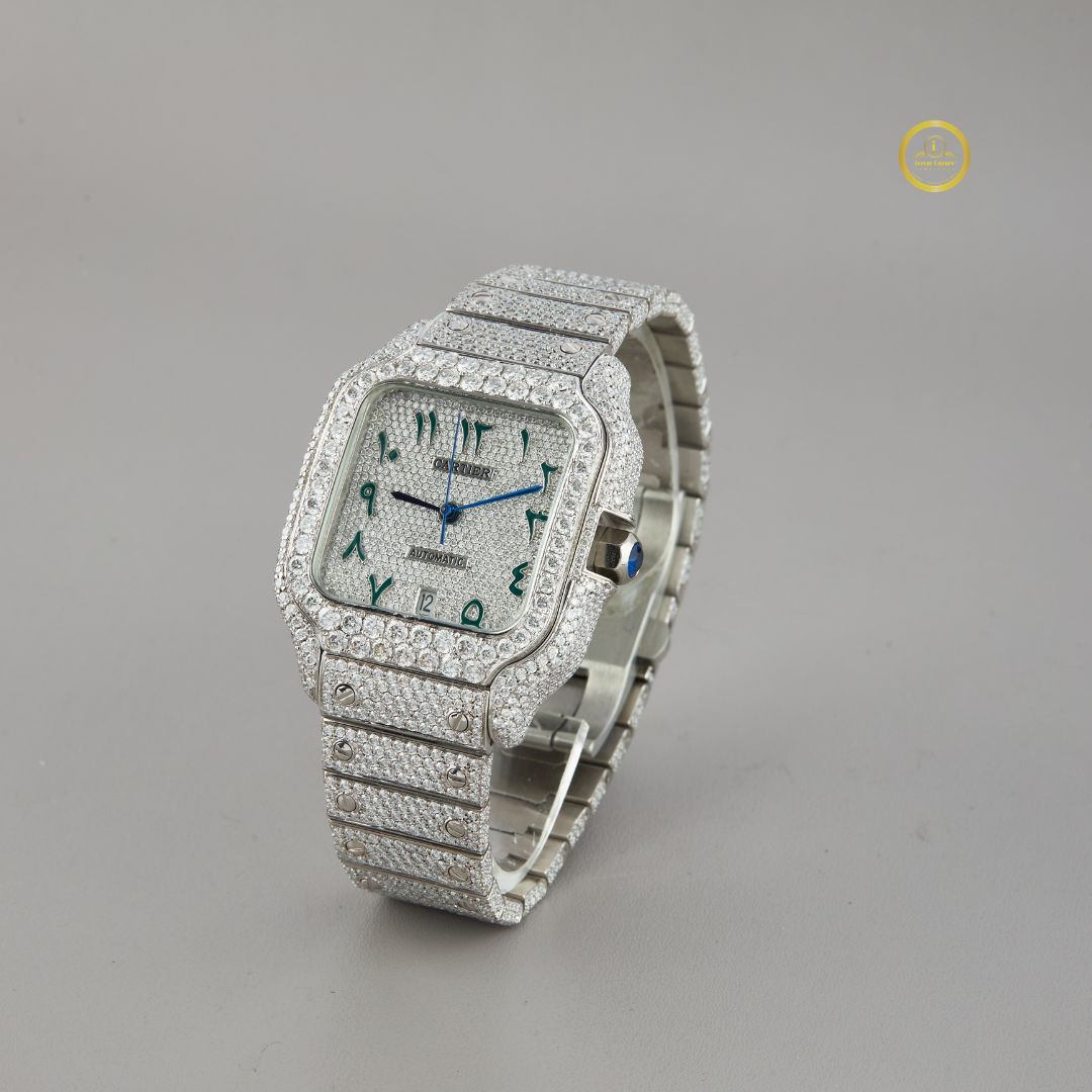 Stunning Moissanite Diamond-Set Luxury Watch with Emerald Green Numerals and Pave Dial Design