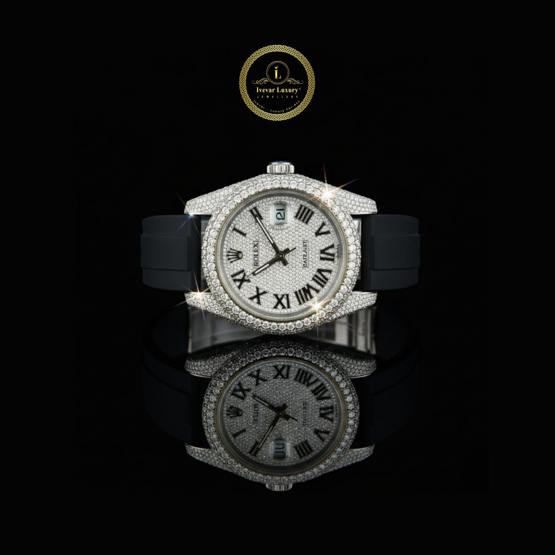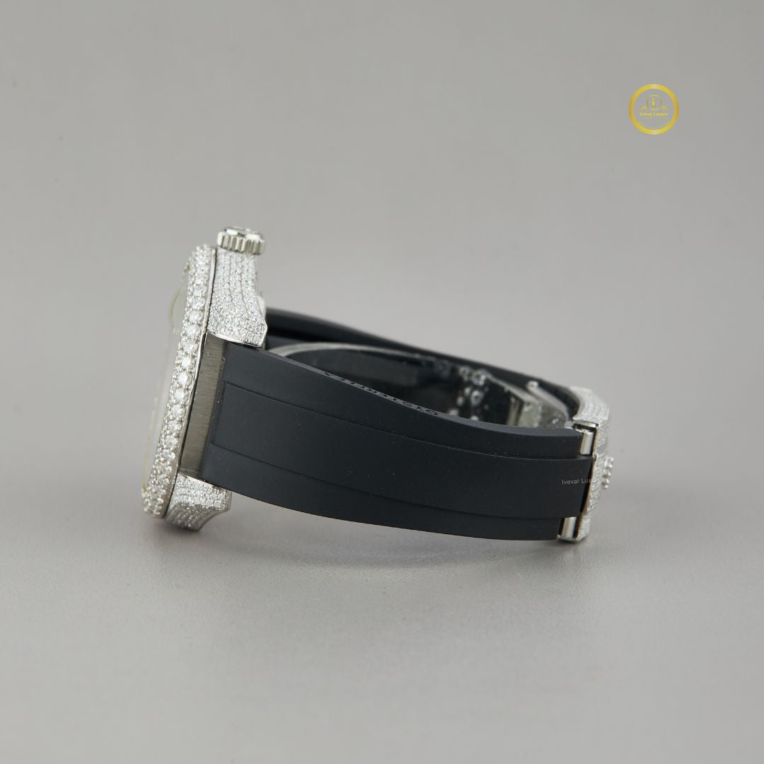 A fusion of sport and sophistication, this Diamond-Paved Luxury Watch captures attention with its fully iced-out case and dial shimmering in round-brilliant-cut stones. The striking Roman numeral markers enhance its timeless aesthetic, while the durable black rubber strap offers modern comfort and versatility. Perfect for those who appreciate statement-making elegance, this watch redefines Ivevar luxury with every detail — a bold accessory for any occasion.