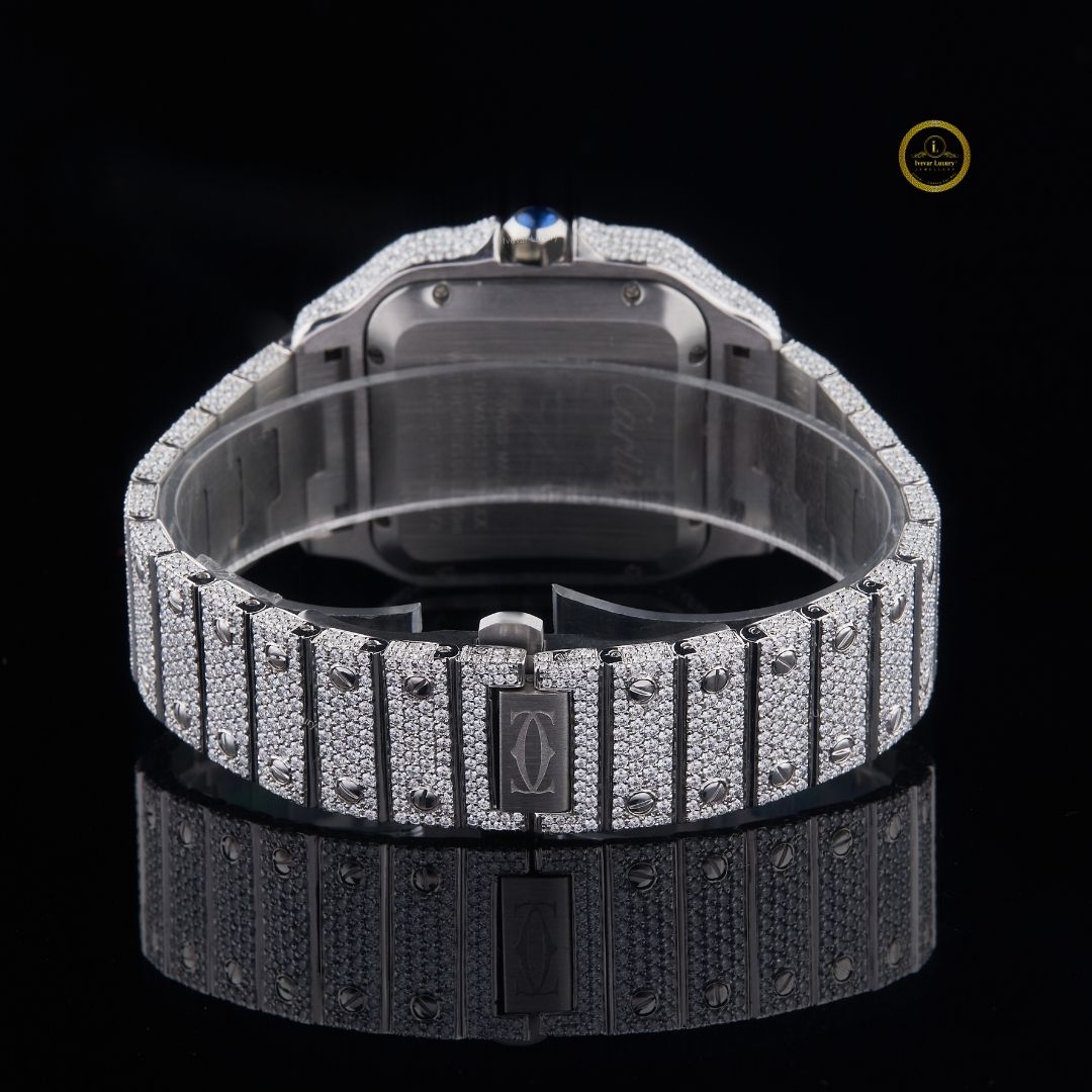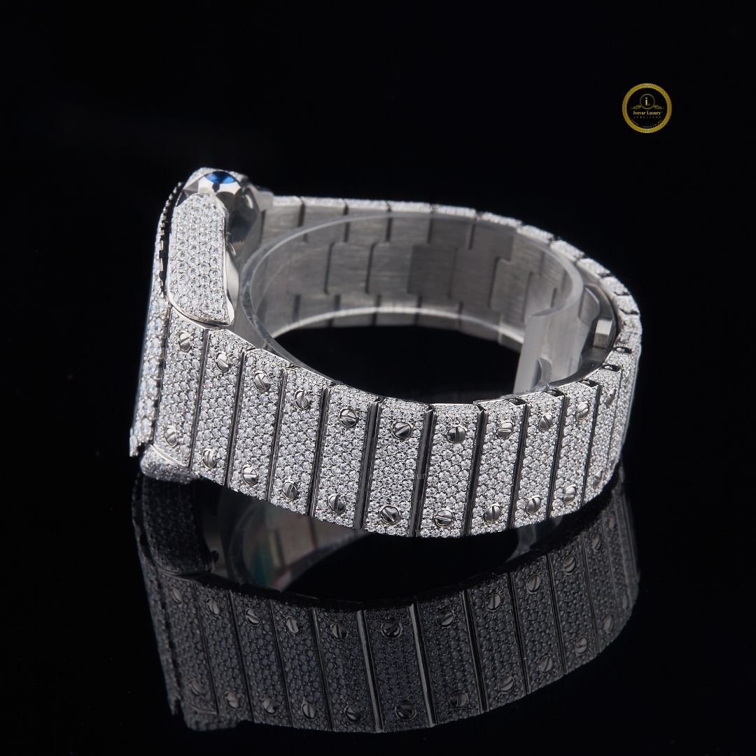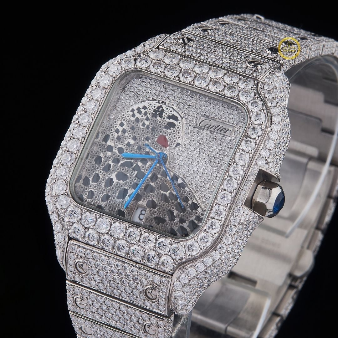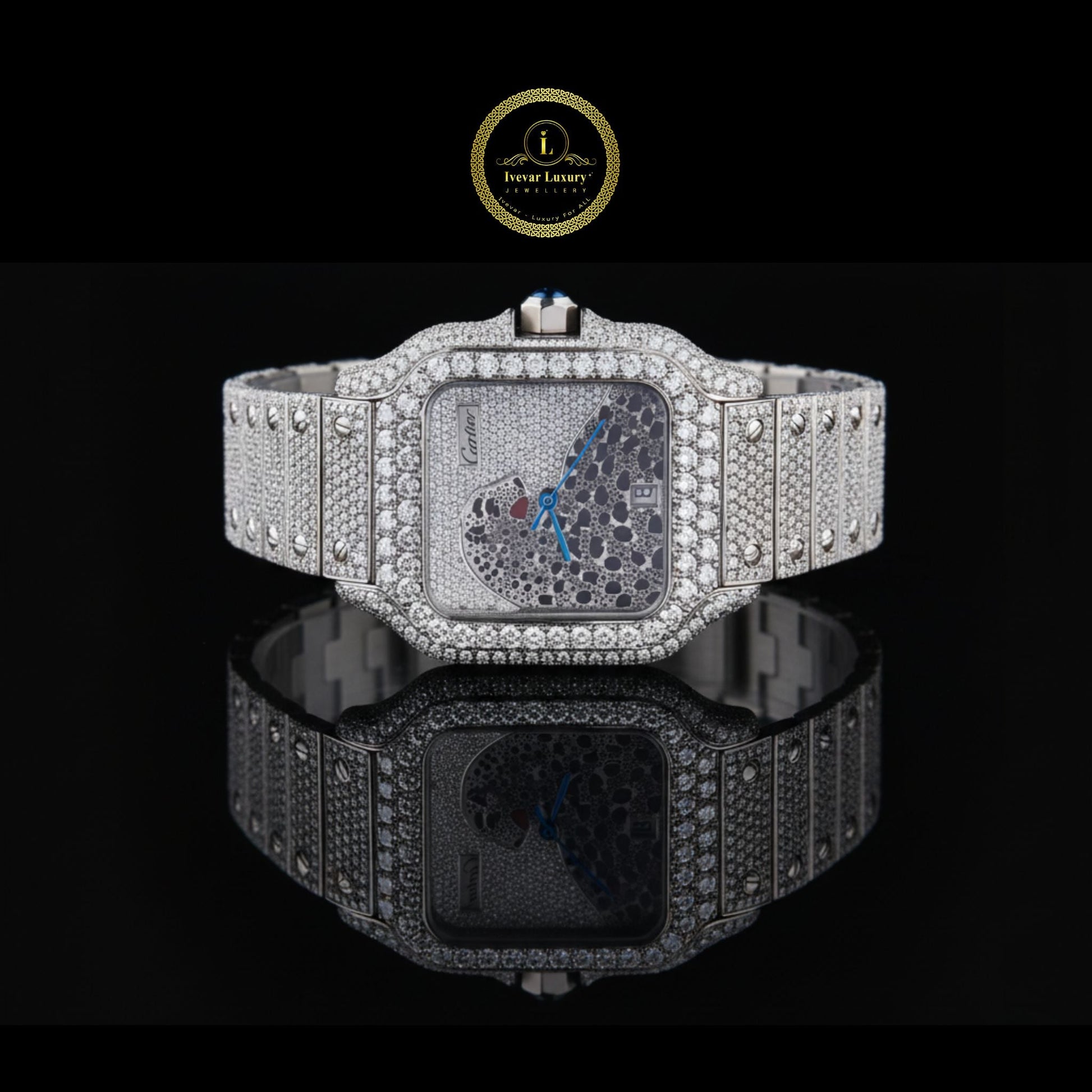 Immerse yourself in the world of luxury and refinement with this diamond-studded masterpiece. Every inch of this timepiece — from its square bezel to the intricately detailed bracelet — is adorned with brilliant-cut diamonds, reflecting unmatched elegance and craftsmanship. The dial showcases an artistic panther motif, representing strength, confidence, and grace, while the vivid blue hands add a striking accent of sophistication. Crafted from high-quality stainless steel, this watch merges artistic design with technical precision, offering a perfect balance of luxury, style, and timeless allure.